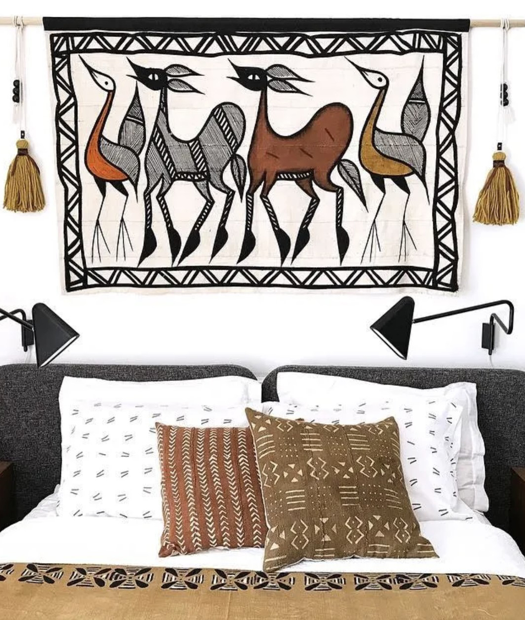 位於西非象牙海岸的傳統泥染工藝,透過獨特的畫法所描繪出的可愛動物圖樣,與自然、動植物、和環境的結合,訴說著當地風土民情與儀式祭典,更為房間添增了一絲活力與風情。
