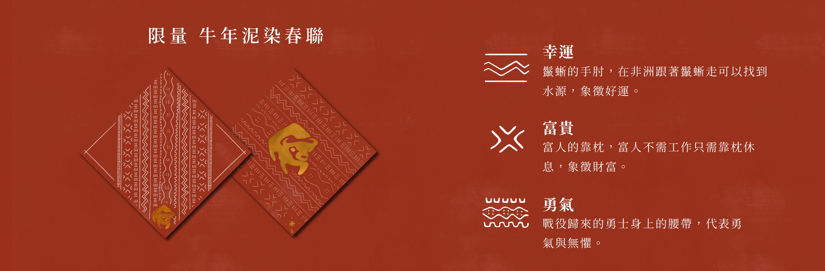 《牛年泥染春聯》融合南方國家非洲馬利的泥染紋路,以及台灣舊曆牛年的新年意象。西非馬利的泥染工藝已傳承超過八百年,泥染幾何圖樣描繪著班巴拉族群的記憶與象徵,以及對自然的尊敬與連結。在家門口貼上別具風格的牛年泥染春聯,新的一年迎來南方的暖風與祝福。