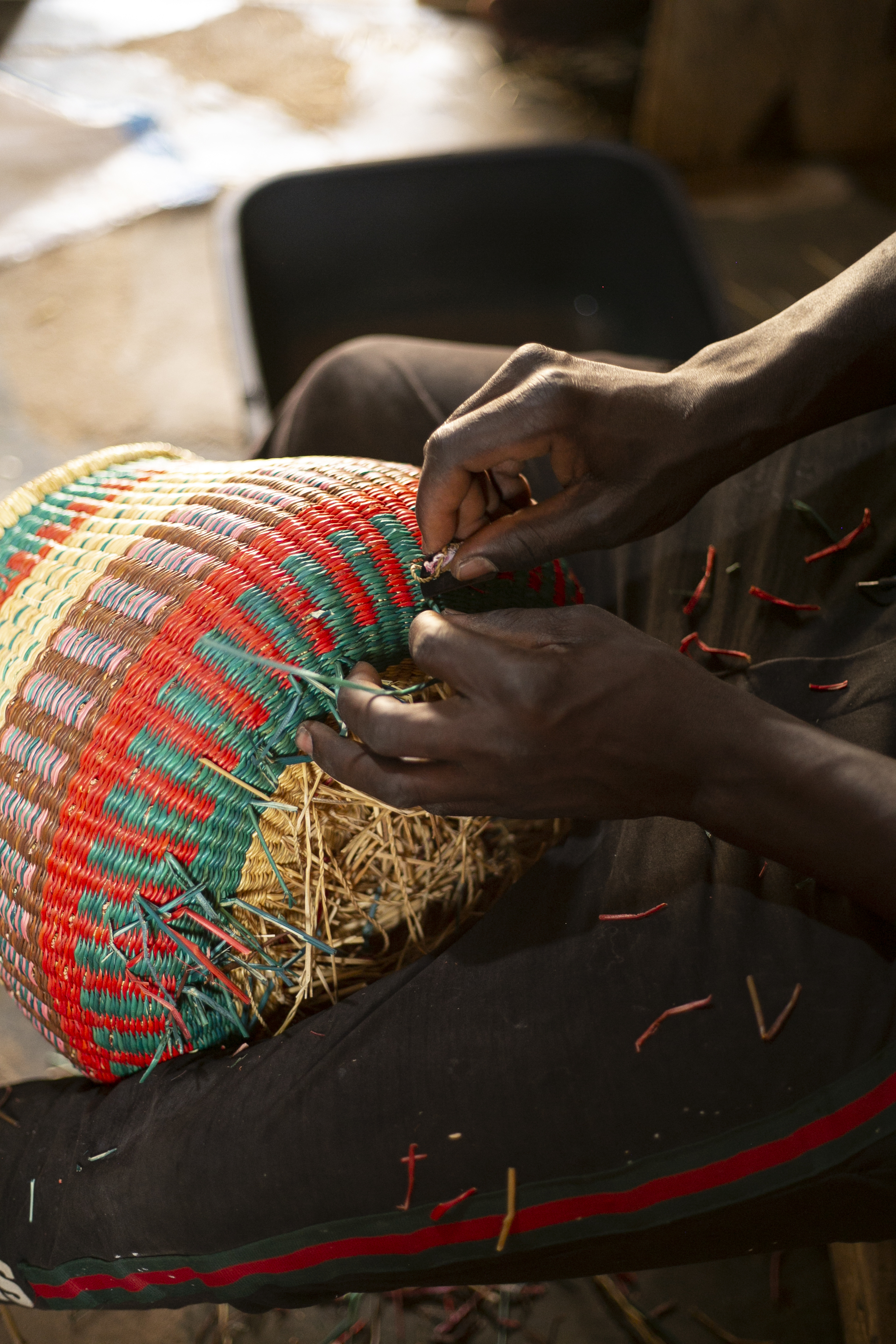 以河邊的蘆葦為編織基底,將蘆葦曬乾一個月,再泡水使其柔軟,編織出堅固耐用的籃子。而後將一種名為 Mulaza 的棕櫚葉煮熟、乾燥,並使用天然植物染料染色,用來裝飾籃子的外層。