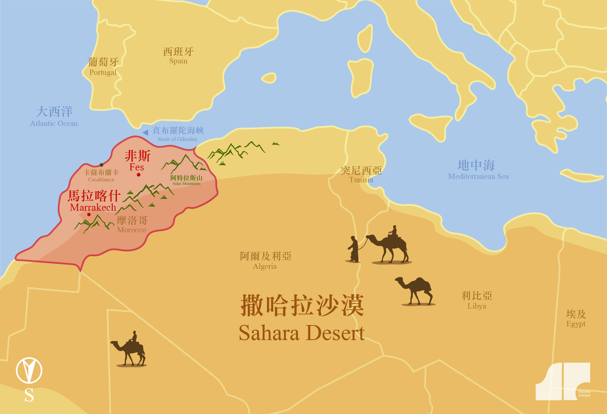 非洲北部被阿特拉斯山脈(Atlas Mountains)一分為二,如台灣中央山脈阻擋東邊來的颱風一樣,它也阻擋了來自南邊撒哈拉沙漠的炎熱空氣,使得山脈北邊能保有濕潤的潮溼氣候,這一帶地區被稱為「馬格里布」(Al-Maġrib),也是現今北非三國摩洛哥、阿爾及利亞、突尼西亞的所在地,緊鄰沙漠的摩洛哥甚至有「烈日下的清涼國土」之稱。