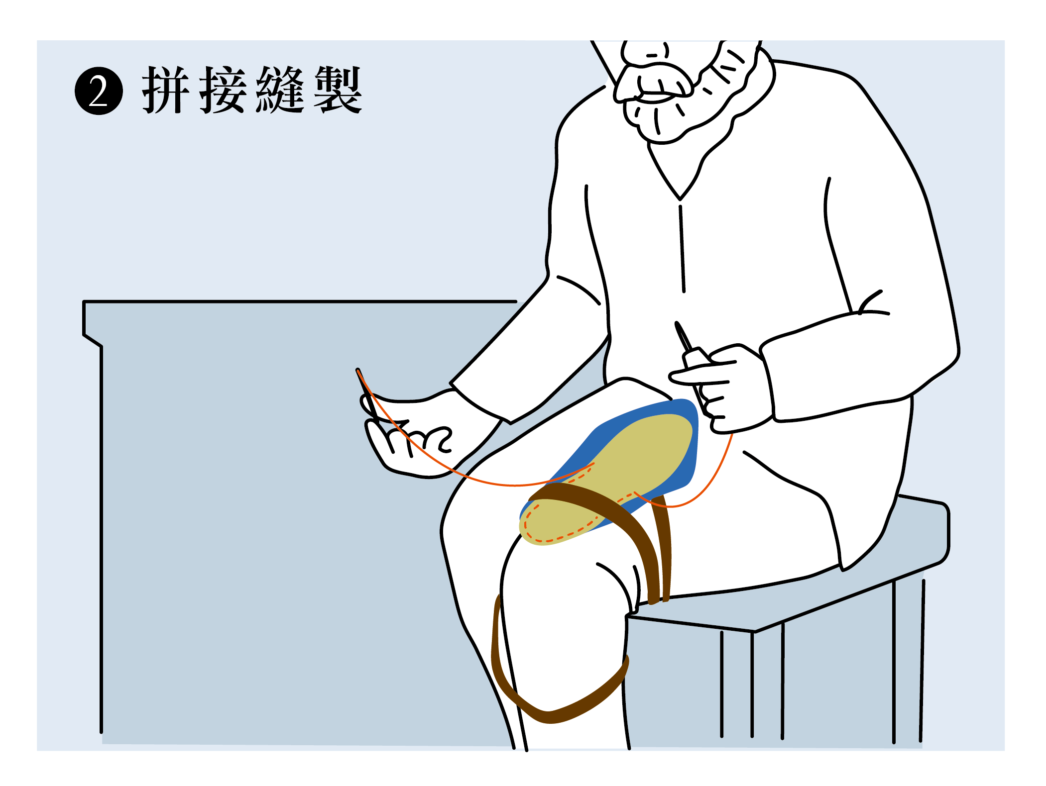 𝟚 拼接縫製:將鞋底與鞋面部分以針線縫緊。