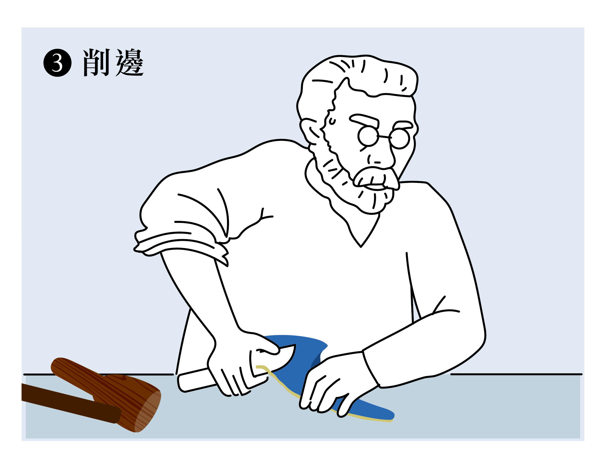 𝟛 削邊:將多餘的鞋底邊緣以小刀削去。