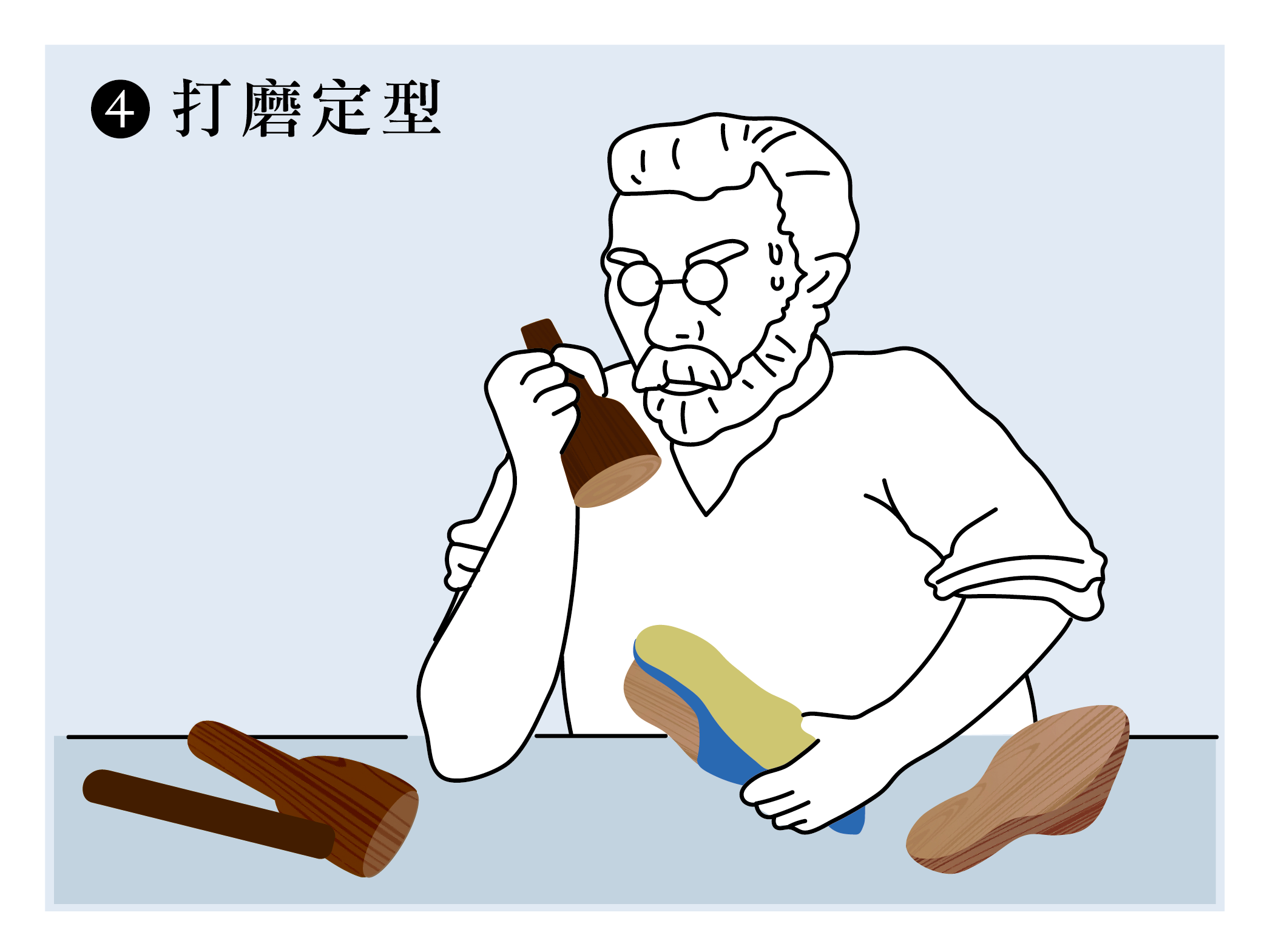 𝟜 打磨定型:最後放鞋模撐起鞋型,用木槌敲打至定型。