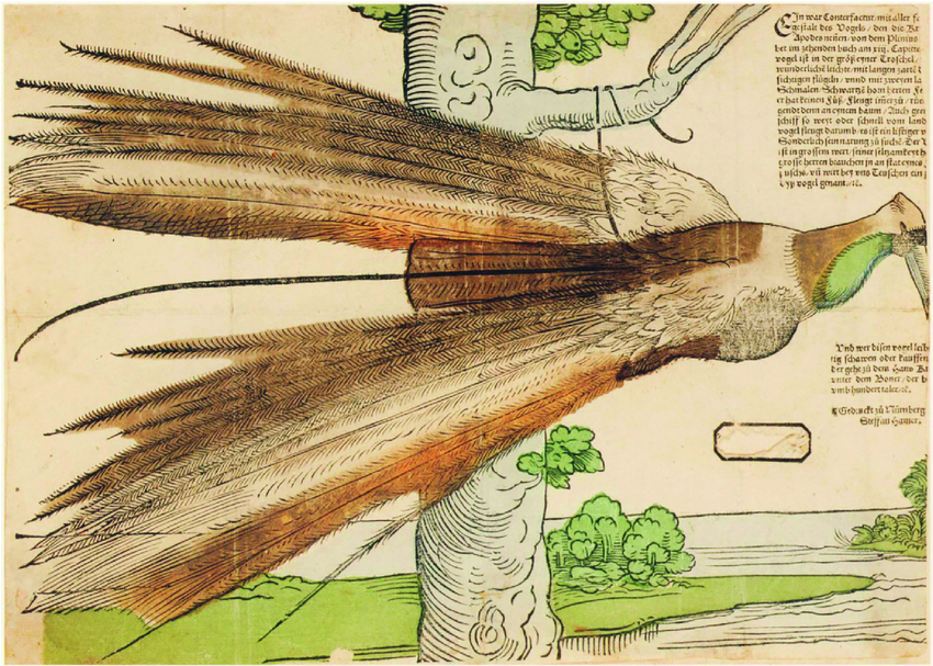 16世紀初,麥哲倫率領艦隊探尋香料群島,完成史上第一次環球航行。船員帶回歐洲的東方珍品中,包含了五件天堂鳥皮毛,那是歐洲人與天堂鳥的首次相遇。