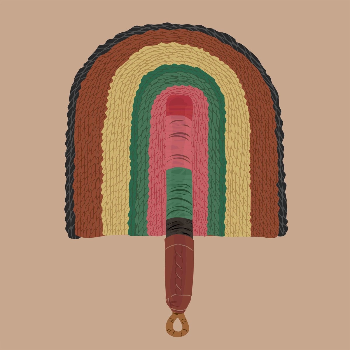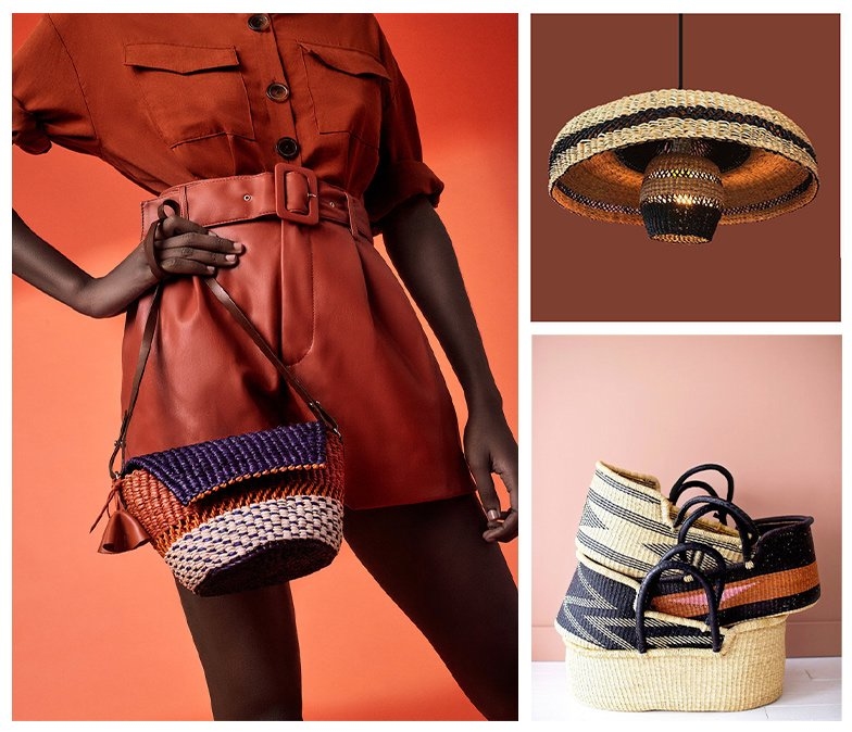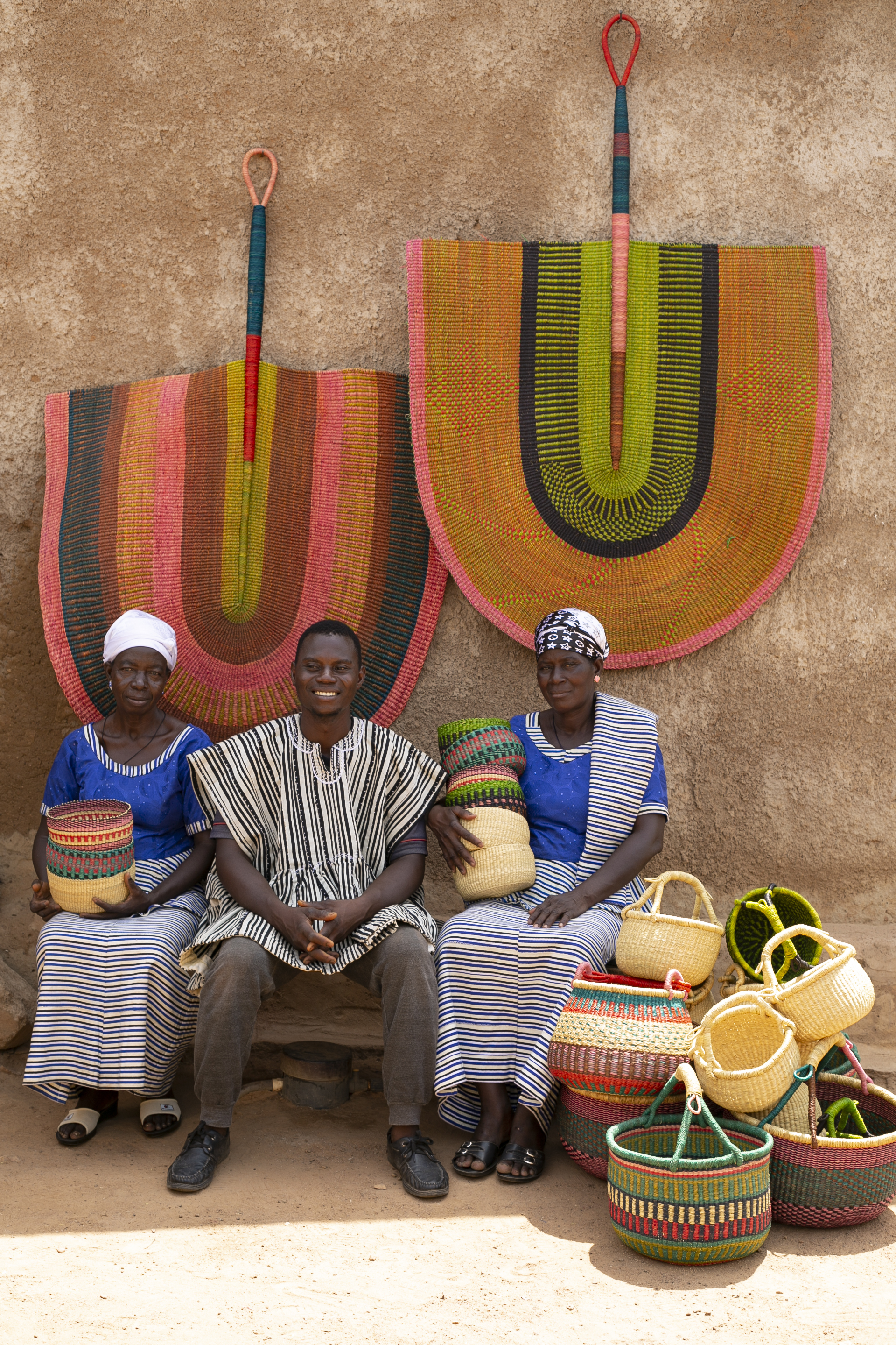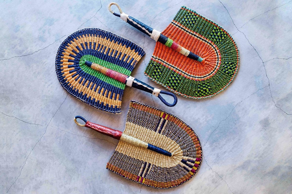 這些色彩繽紛、帶有天然草香的手工編織扇,來自非洲西部國家迦納,被稱作「象草扇(Bolga fan)」。象草編織品(Bolga weaving)常見於歐洲與北美的家居空間,因其強烈的色彩與俐落的工藝,多次登上Vogue、Voyage LA等時尚流行雜誌。現今的象草編織品走向精緻化,且別居設計特色,因而成為全球風格家居的熱門物件,甚至是時尚精品配件。