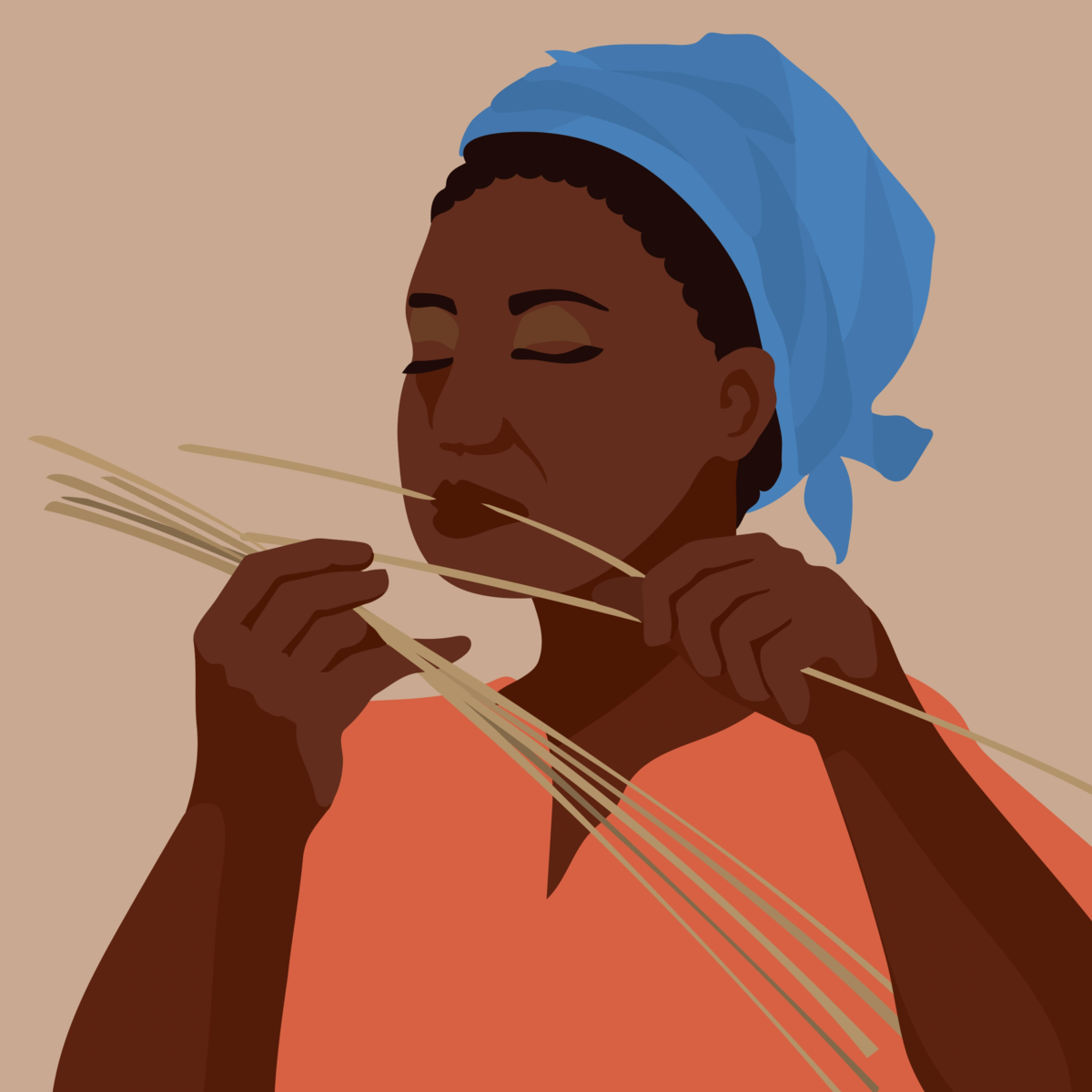 採摘的象草梗曬乾,乾燥後的象草非常堅韌,因此會用牙齒咬裂象草梗,分拆撕成較細的纖維。