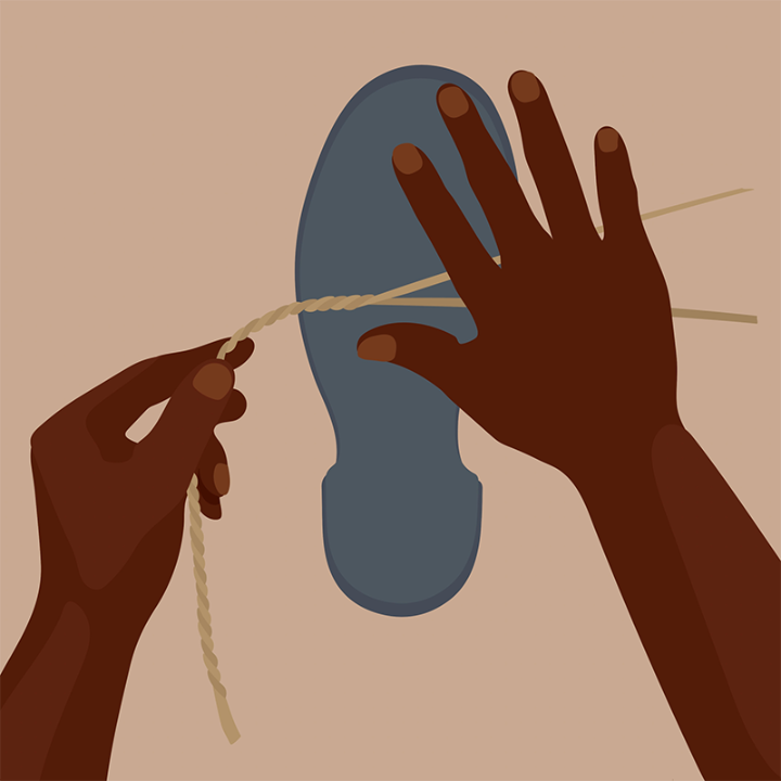 染色乾燥後,需挑出品質良好的象草,才能進行編織。正式編織前會再將乾燥後的象草浸泡於一小盆水中,使象草軟化以便彎曲。