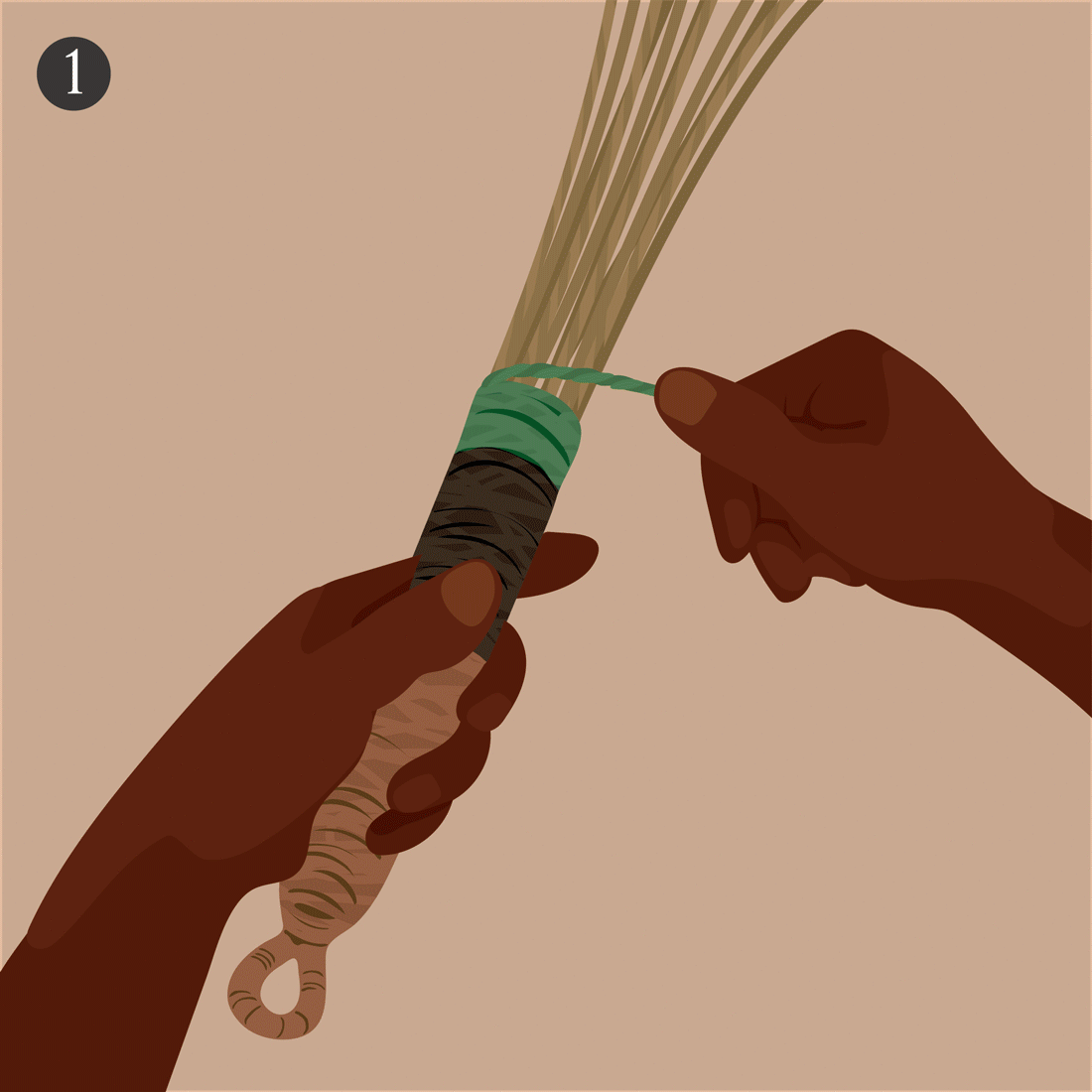 等待象草乾燥後,會搭配當地生產的皮革,在象草扇柄上包覆柔軟的牛皮革,使握把更加舒適。從採摘象草到完成,歷經數天時間的製作,一隻堅固、耐用、帶有草香的象草扇終於完成。