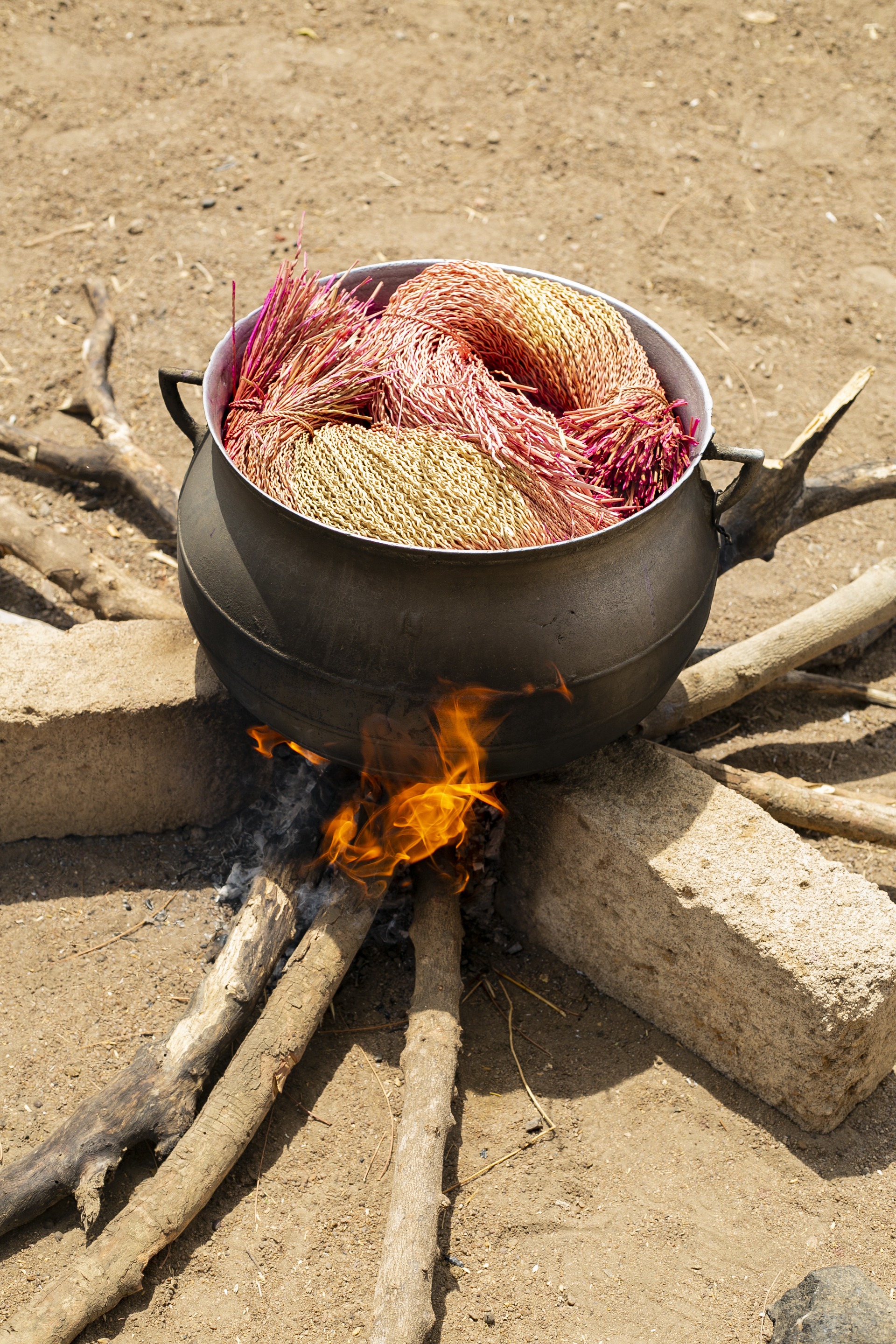 將絞好的象草放入涼水中浸泡一晚,在染色前清洗掉草上的雜質、塵土,染料的吸收效果較好。接著將依比例的鹽、染料混合入沸水中,再將象草放入染色。
