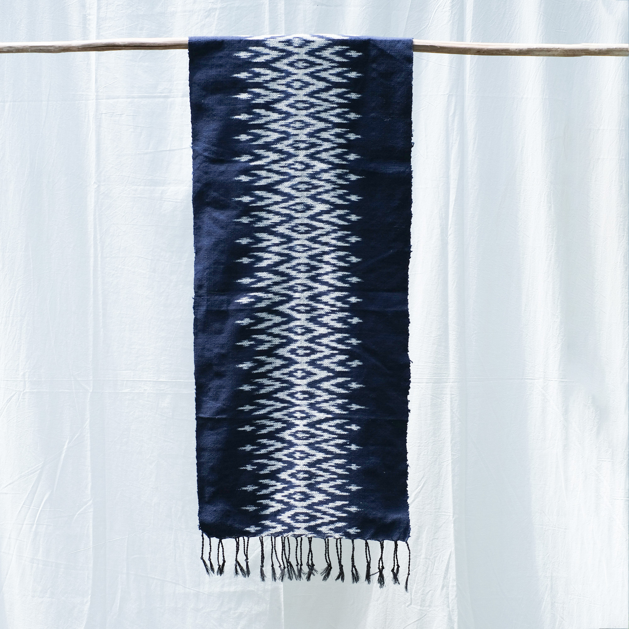 普傣族位於寮國南方的凱山豐威漢省(Savannakhet),他們擅長以手捻棉線結合天然藍染與伊卡編織,織出河流般的美麗圖紋,作為傳統服飾的筒裙與飾巾。有趣的是,在塑膠繩出現以前,據說是以香蕉絲紮綁出預計編織的圖紋。
