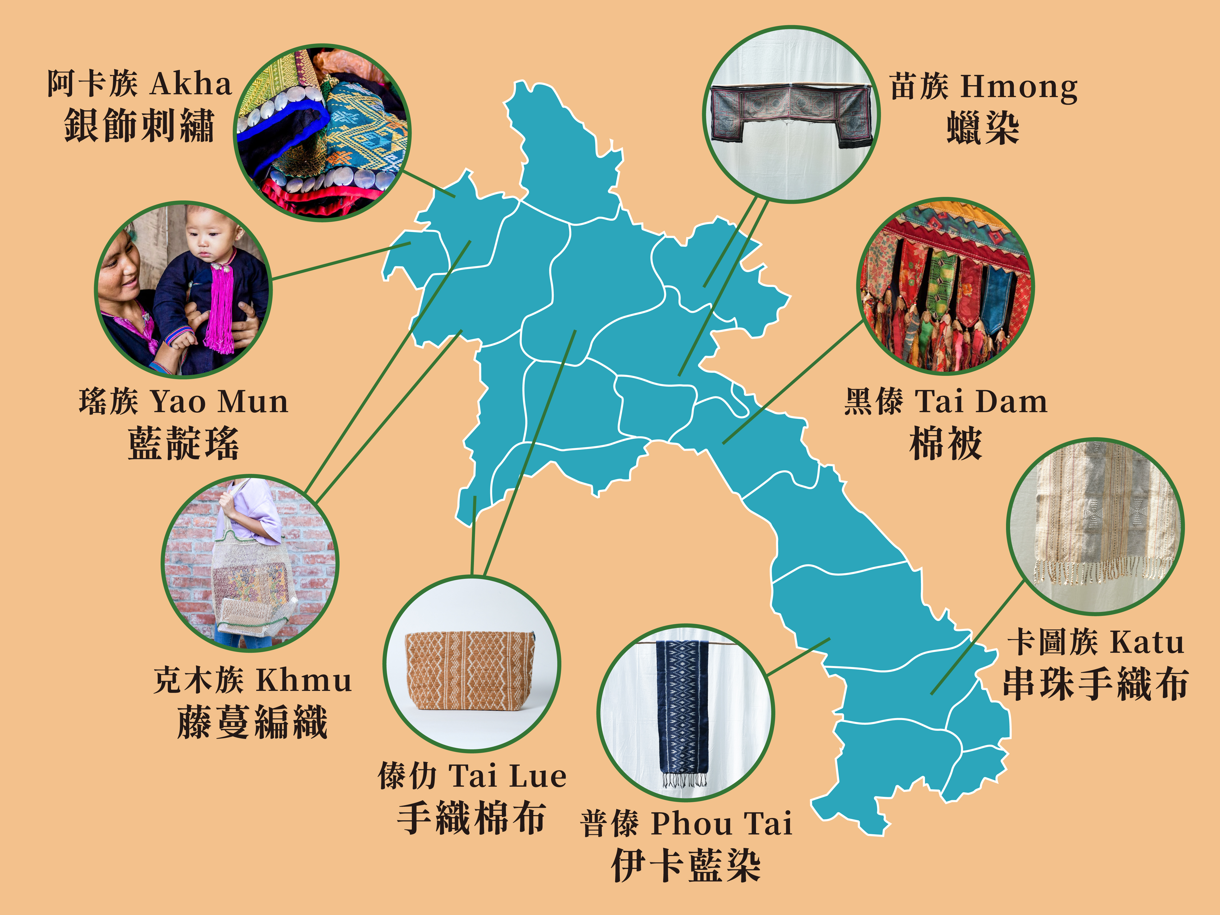 華潘(Huaphan)刺繡是寮國的傳統工藝,常見於女性穿著的裙布裝飾,這些刺繡作品以鮮豔的色彩和細緻的圖案,展現了當地的文化及自然風貌。