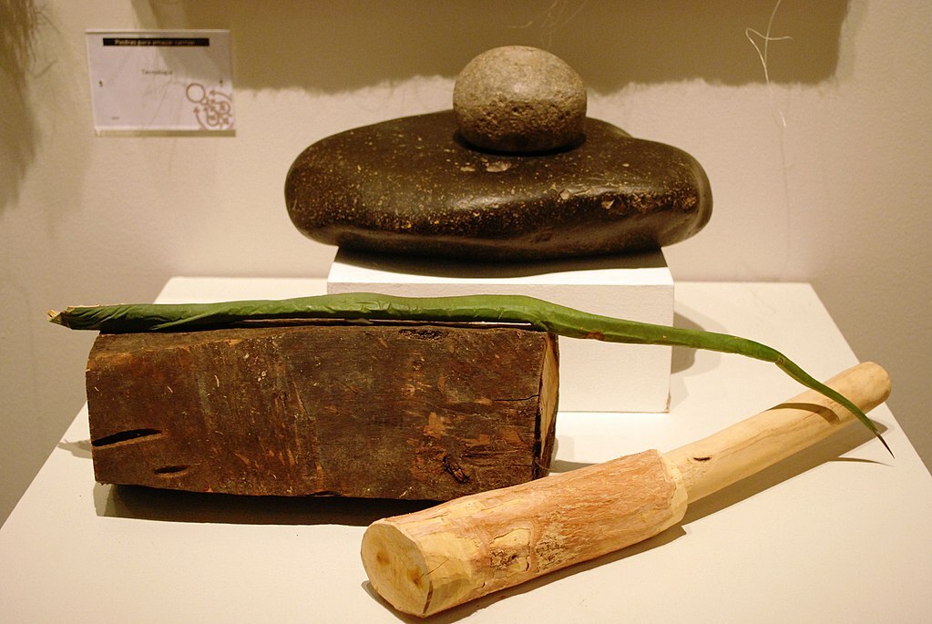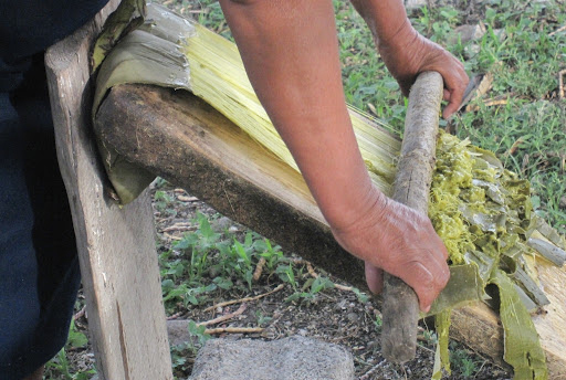 步驟 2-採纖:將烤過的龍舌蘭葉至於木板上,並用木棍、石頭或刀將多餘的葉肉削除,留下植物纖維。