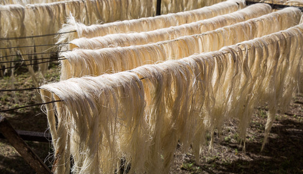 步驟 3-洗滌和曬乾:將龍舌蘭纖維用水洗淨,去除殘留的汁液。然後將纖維曝曬於陽光下至乾燥,若乾燥的時間愈長,纖維顏色就會愈白。