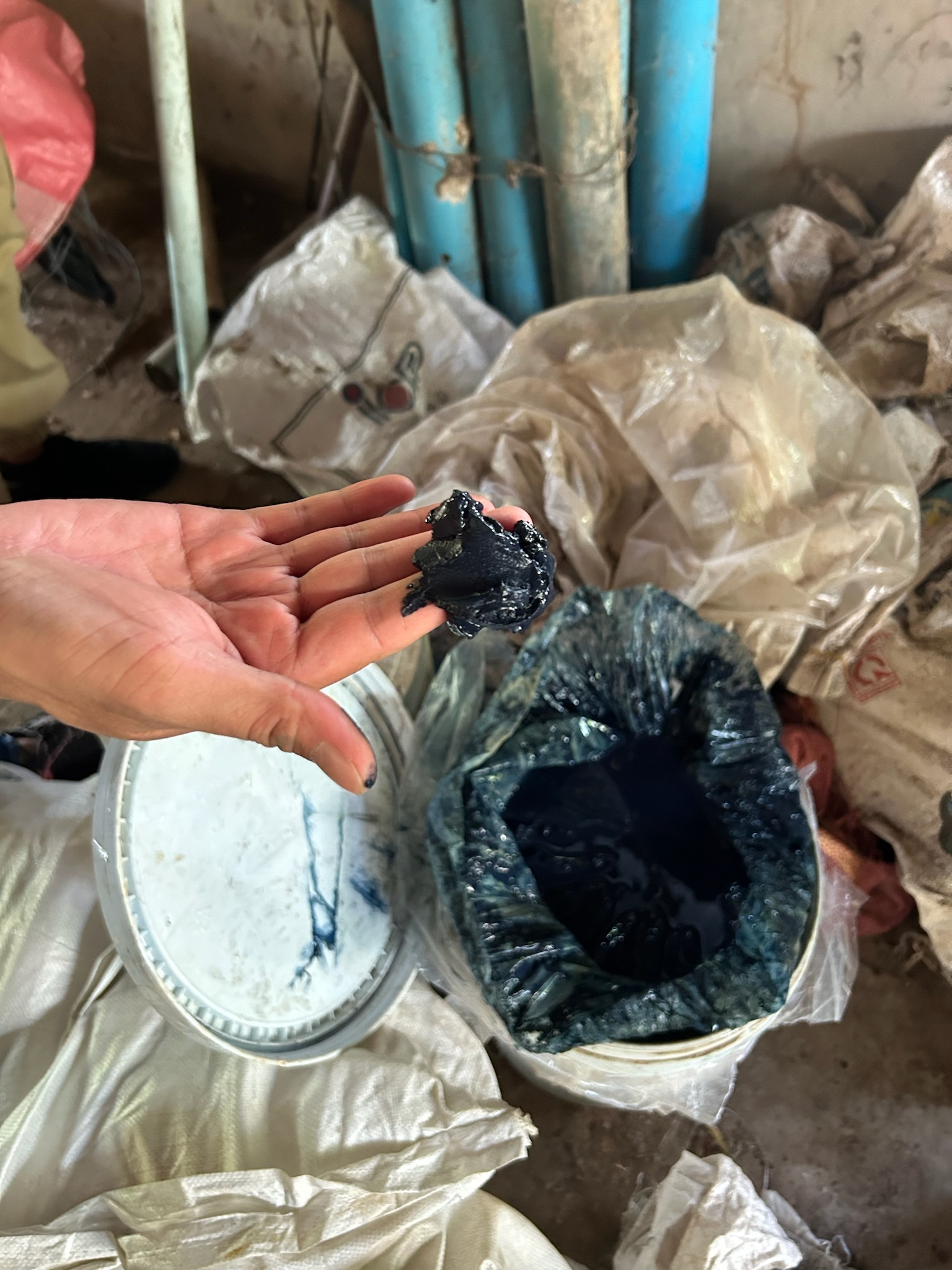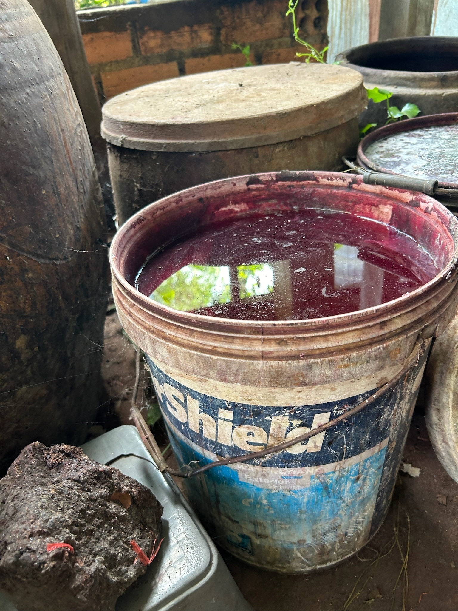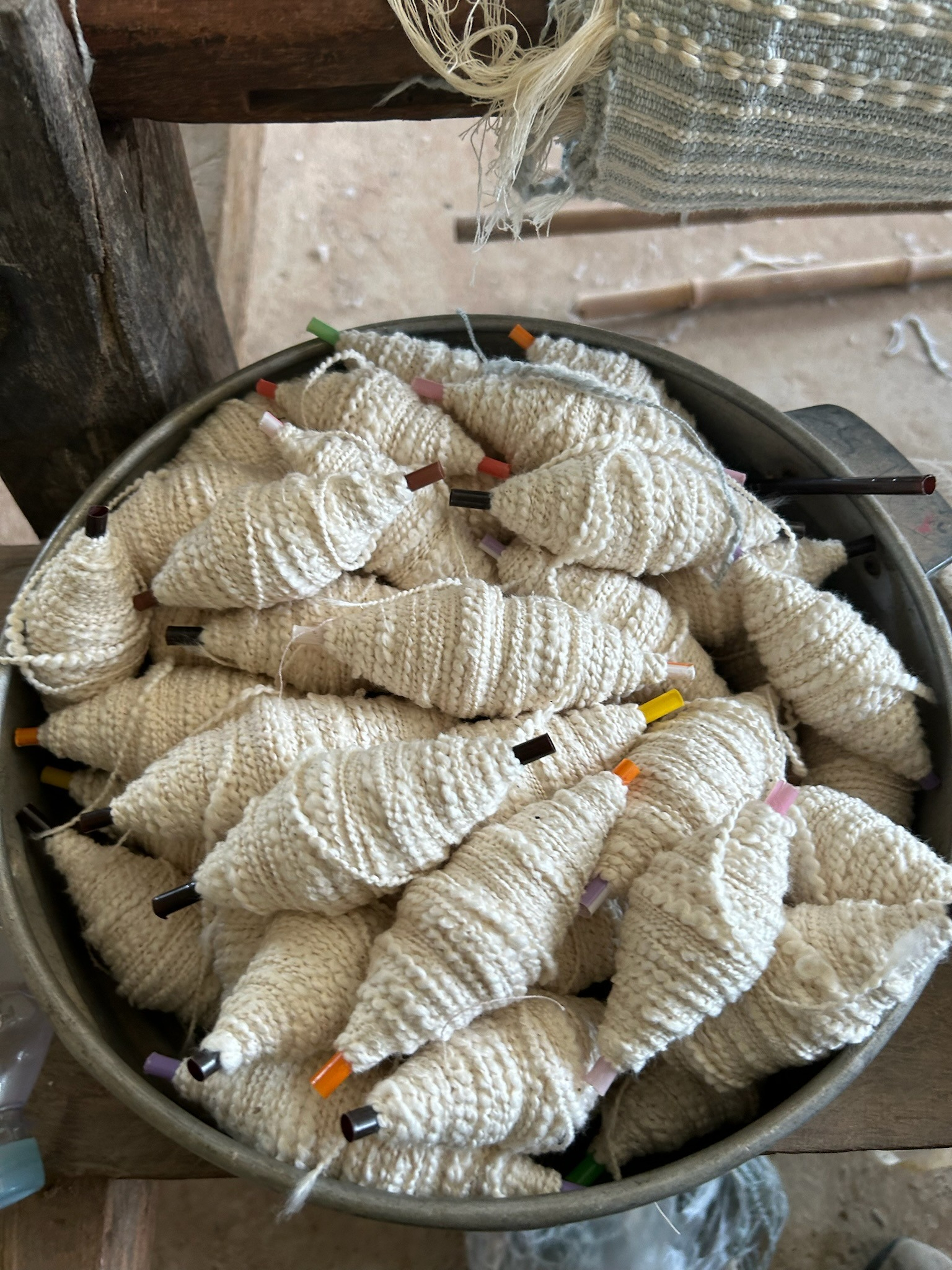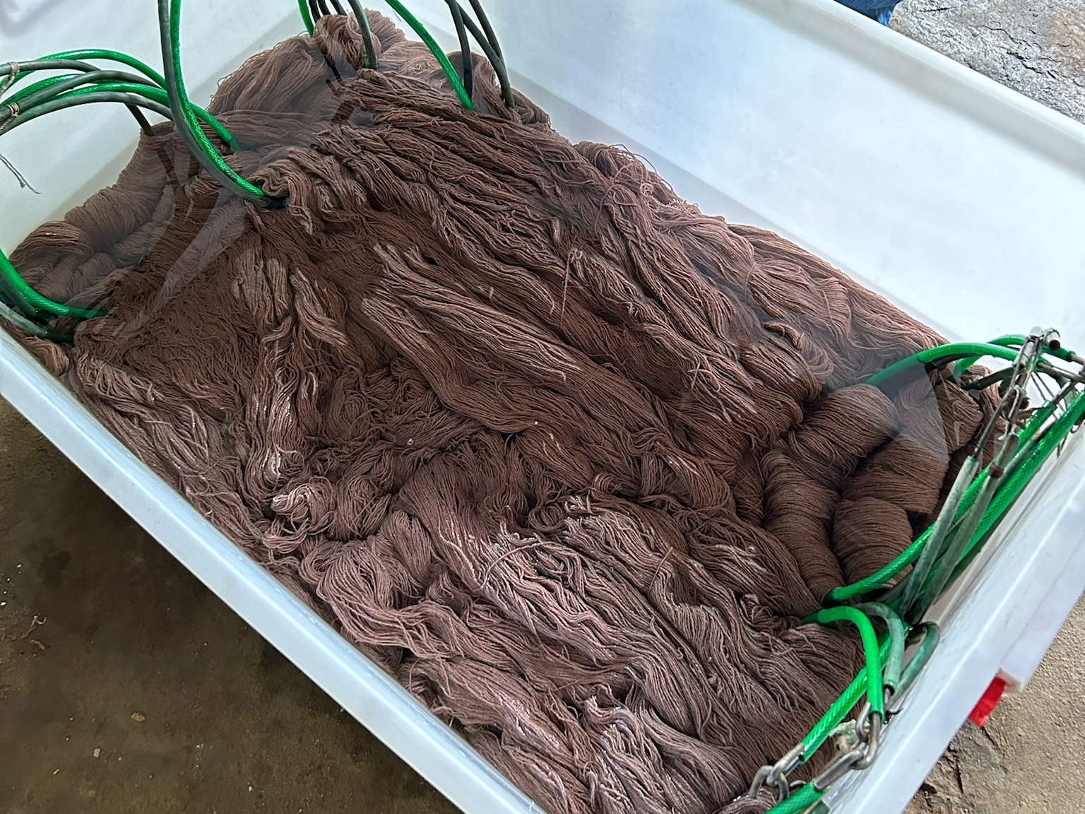 這些紗線得先完成紡紗、染色、整經等前置準備才能開始織布,整個前置過程需要4至6週的時間。FAIR WEAVE的染坊在一戶農家的院子裡,他們蓋了兩個用來加熱染料跟染線的大灶,堅持使用天然染料,如靛青、椰子殼、胭脂樹、芒果葉、印度杏仁葉、萬壽菊花和莢果種子取色,創造出柔和的色調。