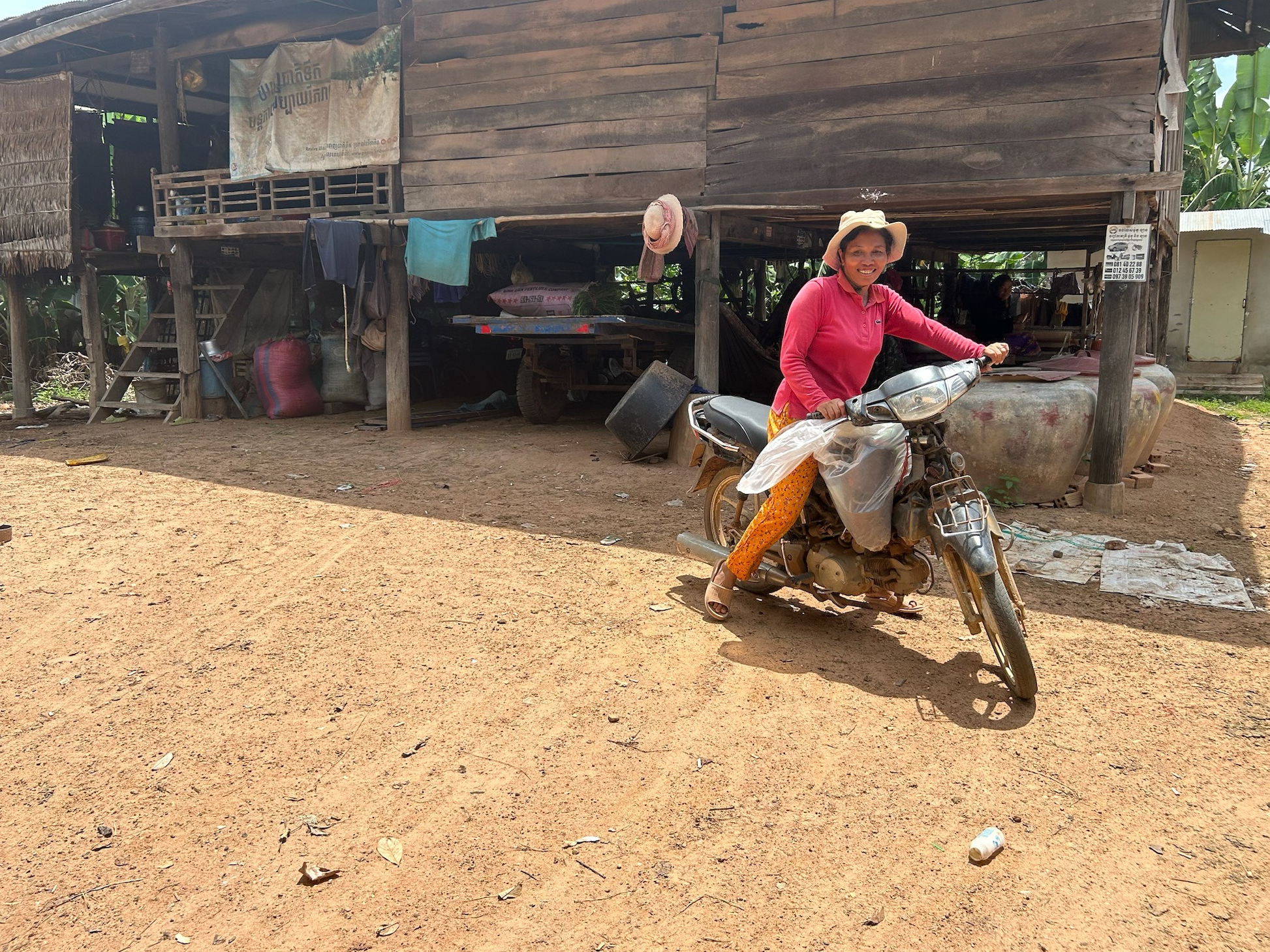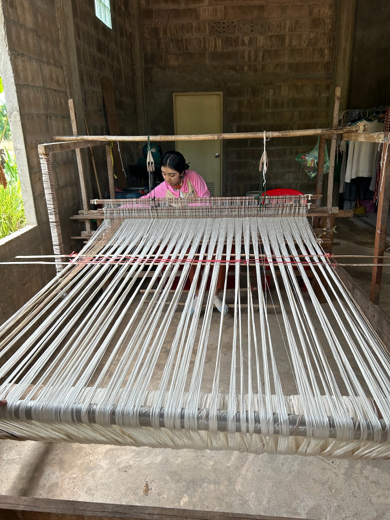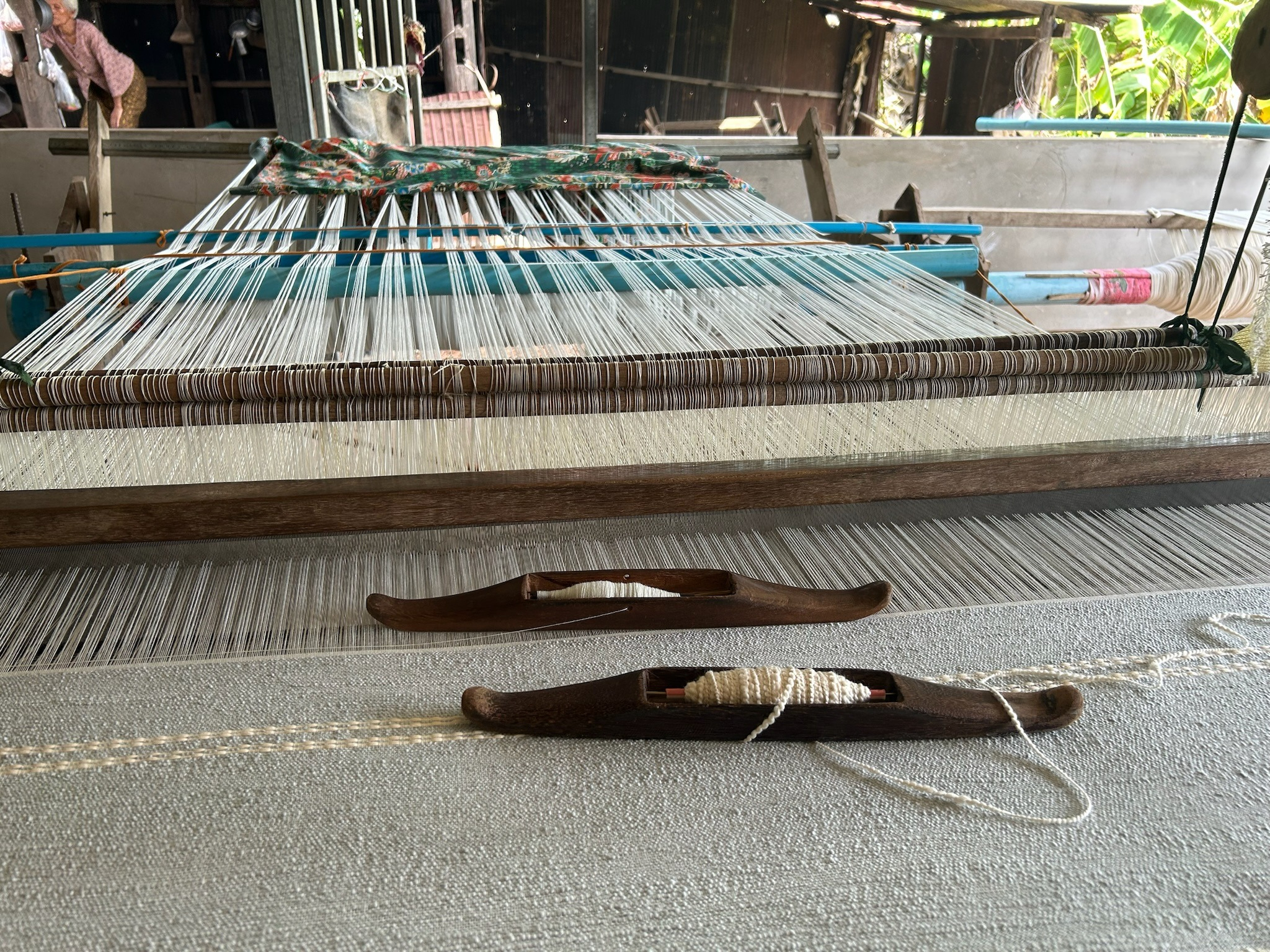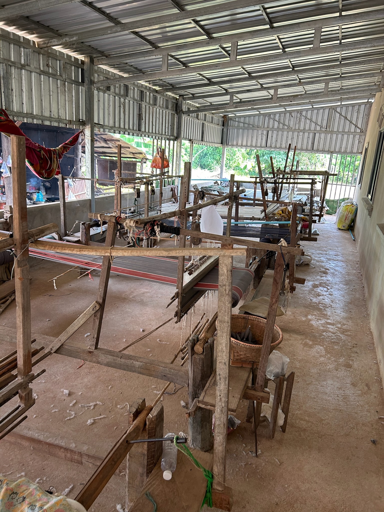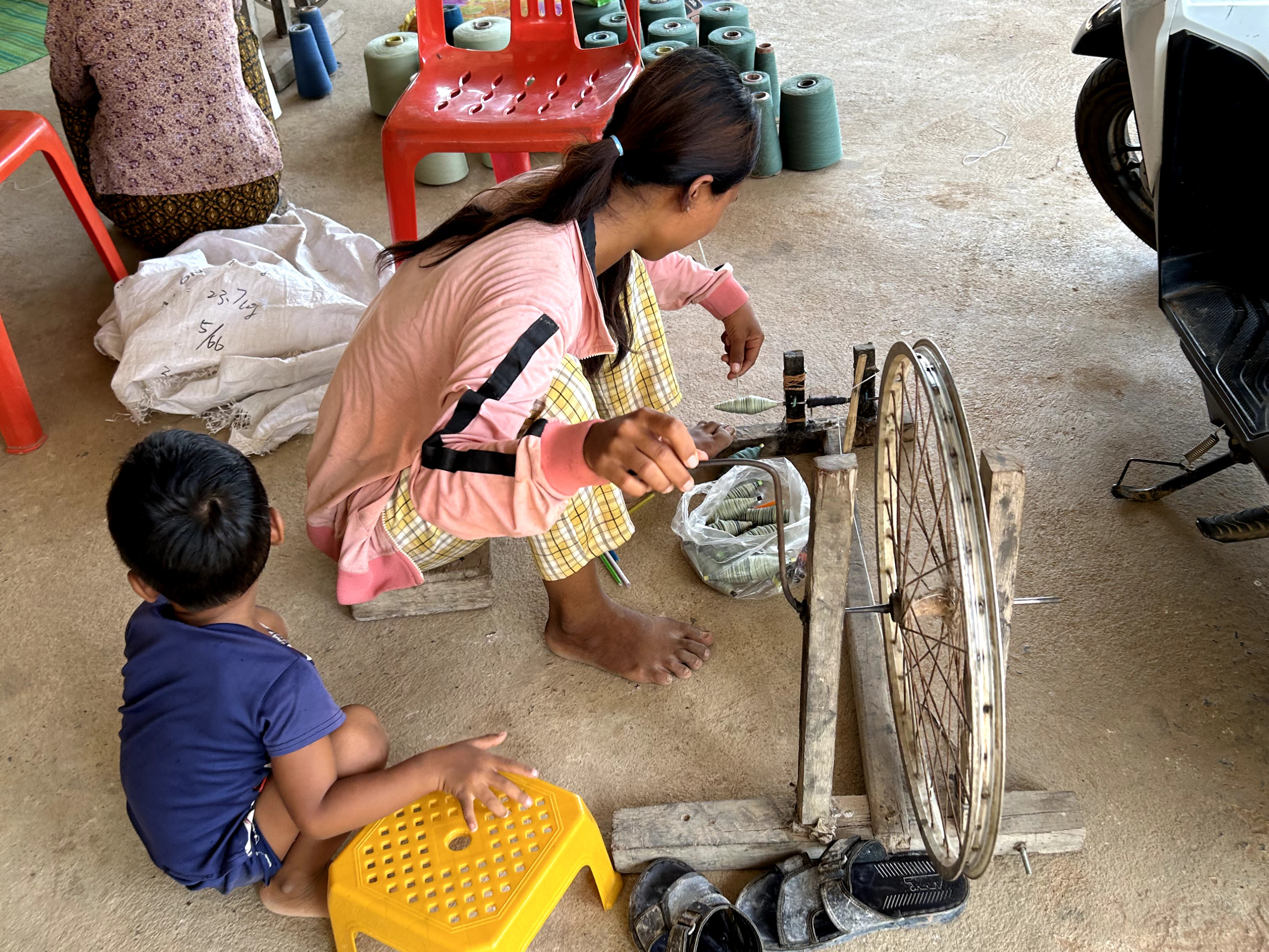 FAIR WEAVE的織布坊距離染坊則要再開車半小時才能抵達,是個居住較密集的農村。柬埔寨傳統家屋的住房多是在二樓,一樓用柱子架高,底下是極為通風沒有牆壁的地方,可以放置摩托車、雜物,以及雞鴨小孩活動的空間,家家戶戶有的手織車也會放在這裡。在家就能織布對織女來說非常方便,可以一邊帶小孩或做些農事,一有空就織一下布,時間很彈性。