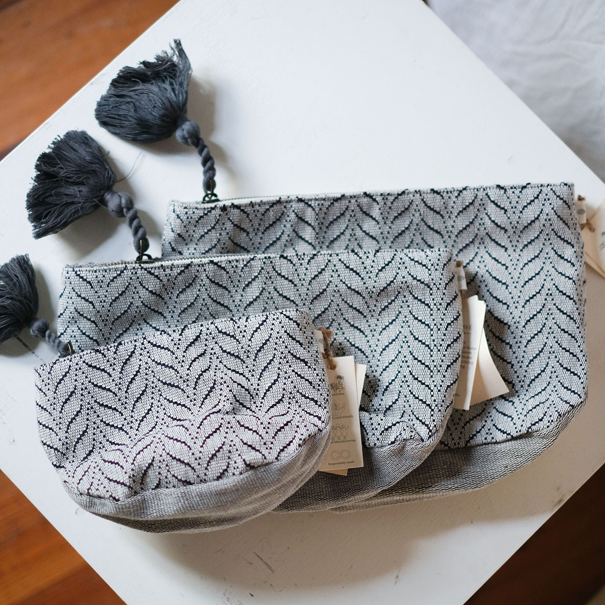 這款棉織收納包,有三種尺寸,設計有流蘇裝飾,內袋附有拉鍊,收納各種小物,也適合當作外出手拿包。