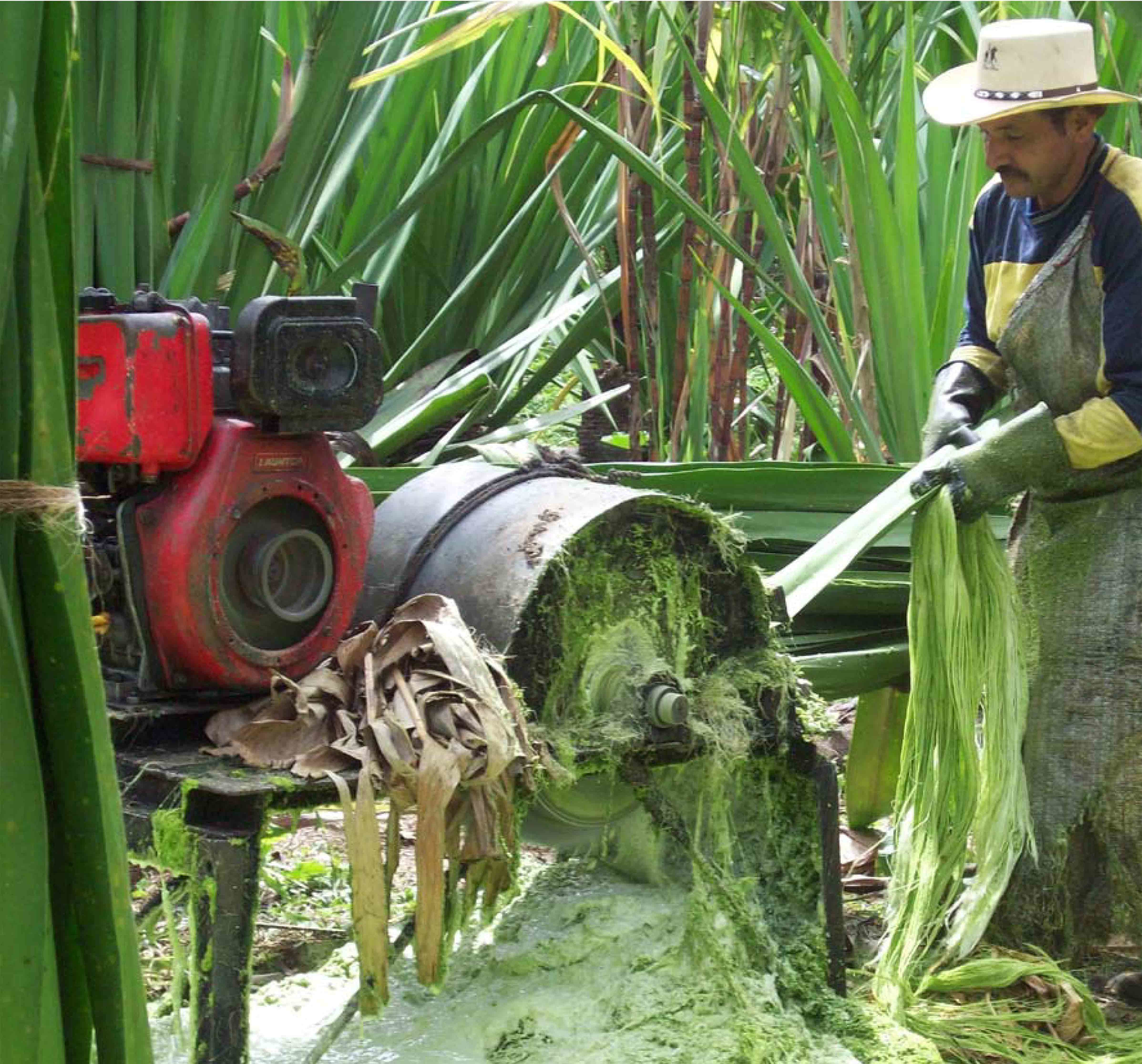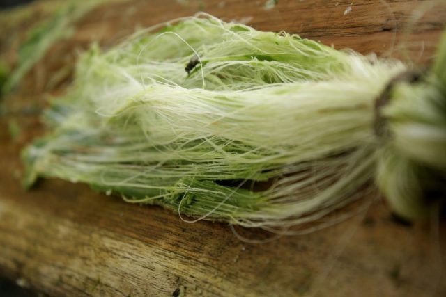 步驟 1-收割與採纖:從菲克上斜切下大小足夠的葉片,放入採纖機中將多餘的葉肉清除,留下菲克纖維。