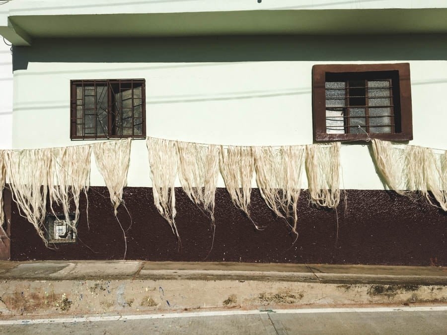 步驟 2-洗滌和曬乾:將菲克纖維用水洗淨,過程約需浸泡12到15個小時,以去除殘留的汁液。然後將纖維曝曬於陽光下,若乾燥的時間愈長,纖維顏色就會愈白。