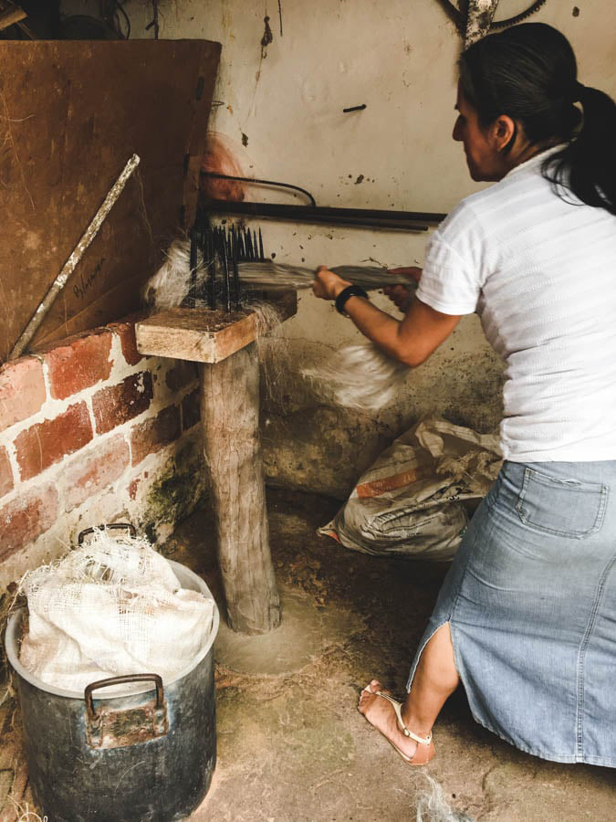 菲克不僅是哥倫比亞特有的一種植物,其纖維強韌扎實,更可以被使用在各種民生用品中,像是繩索、承裝農產品的袋子等,被認為是僅次於棉花的第二重要線材。工人們會將菲克的葉子切下並進行加工,葉片中特有一種堅韌的植物纖維,經過抽絲、洗曬、染色、捻線等費工的製作過程,成為菲克編織的線料。