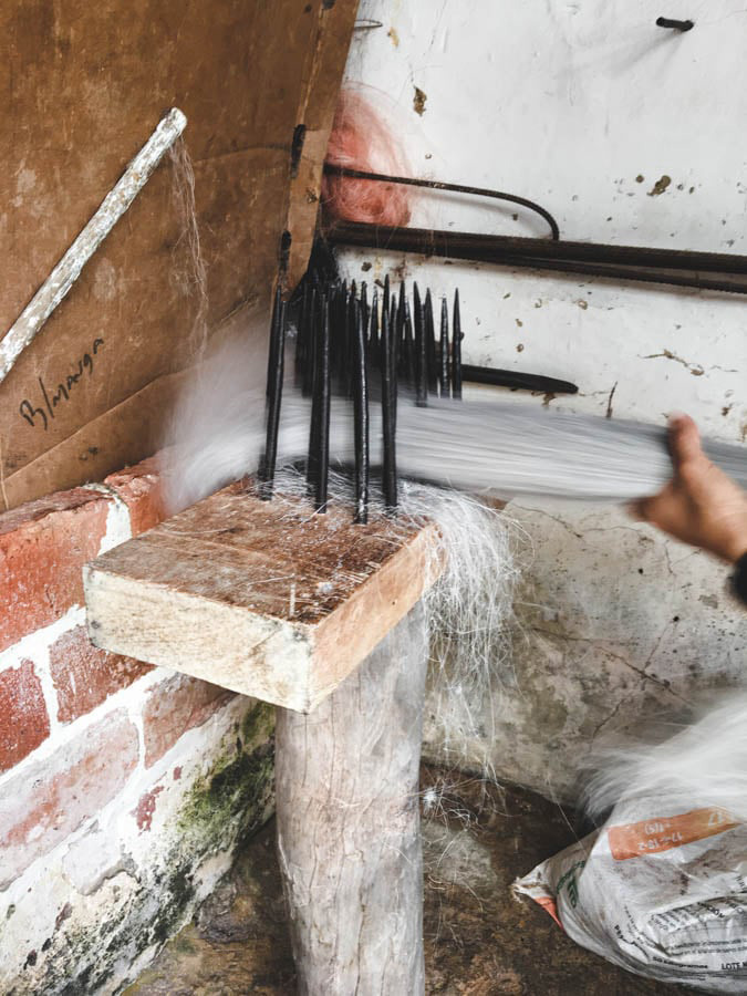 步驟 3-梳理麻絲:將成捆的纖維放上有許多釘梳的梳麻機上,用力拉扯將打結的纖維如同梳子般梳理開來,拉直形成柔順的纖維。