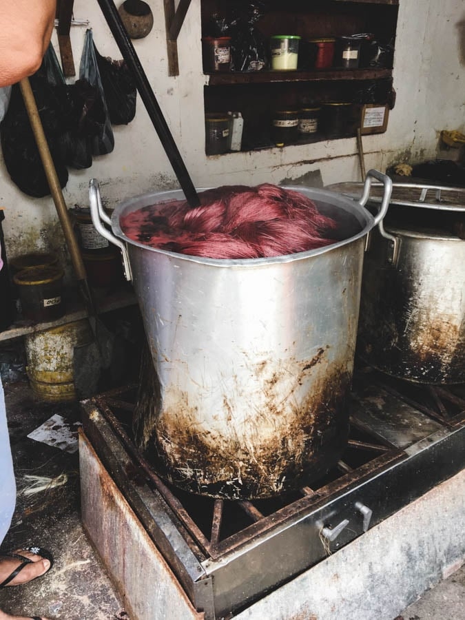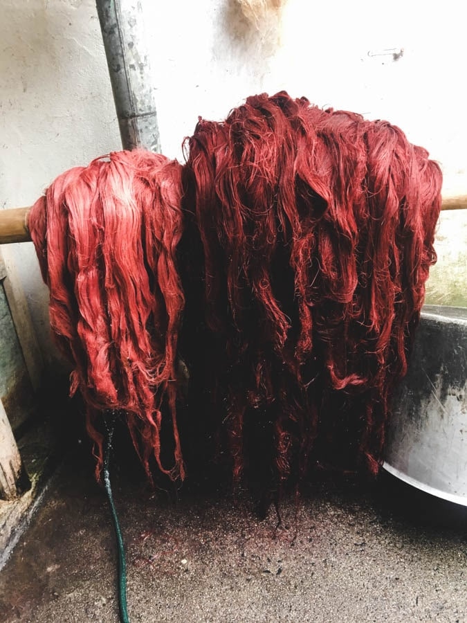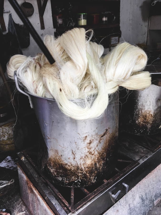 步驟 4-染色:將菲克纖維放入裝有天然染料、水、鹽、及固色染媒劑的鍋子中,將染劑煮沸並持續沸騰五個小時,使染料與纖維能充分上色,此過程又稱為熱染(煮染)。煮後再次充分洗淨,避免多於染劑殘留而影響品質,之後再將纖維置於陽光下乾燥。