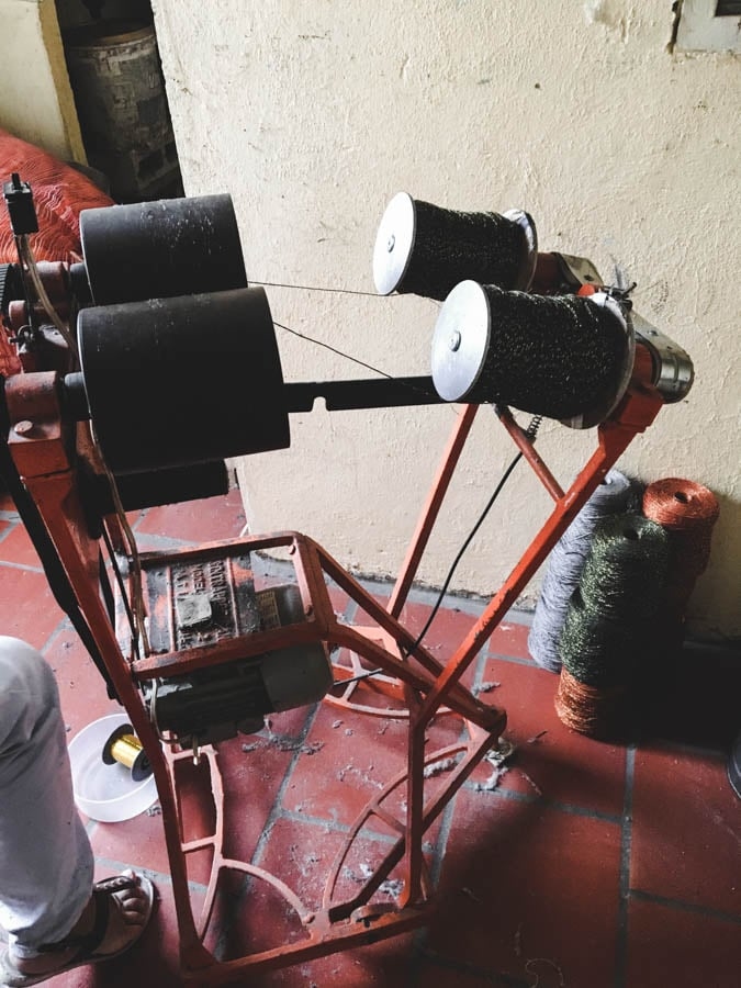 步驟 5-撚絲:將蓬鬆的纖維撚緊,在撚絲機與指尖的配合下,將纖維連接在一起,並纏繞成一捲捲的線圈備用。
