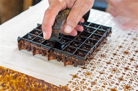 傳統上,婦女會用一尖嘴的銅壺筆(copper canting),一筆一劃以熱蠟緩慢地描繪圖案,需要高度的專注力。19世紀中葉後,模板印章開始流行起來,最受歡迎的圖案都被做成印章,不需再手繪,大量提升生產效率,但依然是屬於傳統的工法。