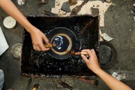 將染好、風乾且確定不掉色的布料放入熱水中煮,攪動布料使蠟融化脫落。透過此方式分解出的蠟能被回收再次使用。