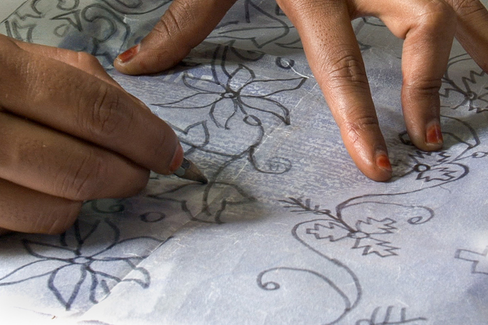 工藝師會在紙上先設計圖樣,再用鉛筆將圖樣轉繪於白色織布上。