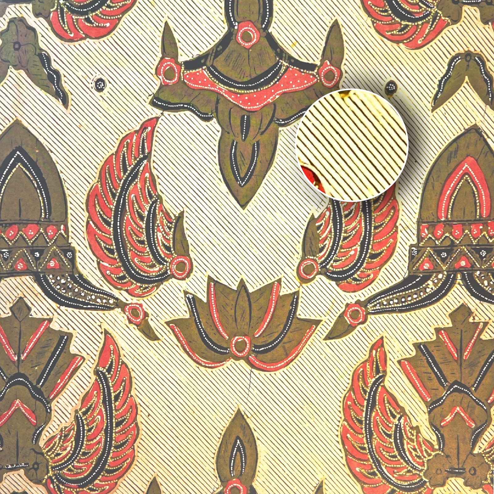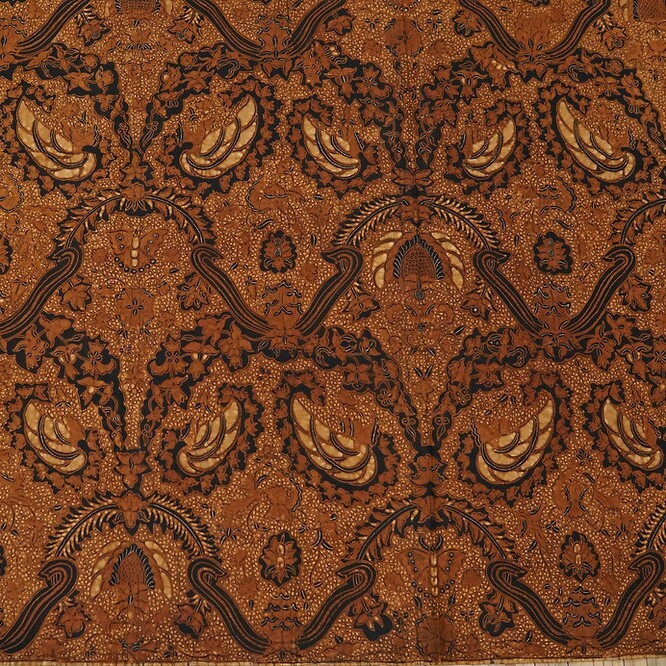 同時,爪哇皇室也規範特定圖紋為皇室專用,如巴冷紋(Parang)、嘉應紋(Kawung)、蘇門紋(Semen)等紋飾為皇室專屬紋樣。例如,外形似劍的巴冷紋代表安全,傳說中爪哇王子 Panja 因穿著它而免於被傷害;嘉應紋則是當地盛產的棕梠,象徵有益的、有用的,這圖像有時也被視為蓮花,象徵長壽與純粹。