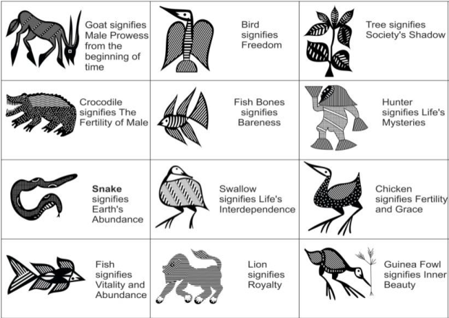 圖案透過描繪動植物、太陽、月亮等元素,表達人們對於自然的敬重和與人的連結。每一種動物和自然元素都有其特別的含意。像是名為珠雞(Guinea fowl)的鳥類,代表女性的內在美;魚則是象徵活力與豐收;獵人象徵人生的奧妙;山羊則代表男性的實力。