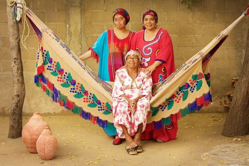第二種是南南計畫01手工編織包介紹過的瓦尤(Wayúu)部落。位於哥倫比亞和委內瑞拉交界一帶的原住民,編織技藝僅由母親傳給女兒及孫女,使得他們的編織包與吊床舉世聞名。不同於網狀,瓦尤擅長的織布成了吊床的主體,不僅美麗也具備了防蚊的功效。現在賣場可見的軍用吊床、帆布吊床的原型,便是近似瓦尤式吊床的概念。