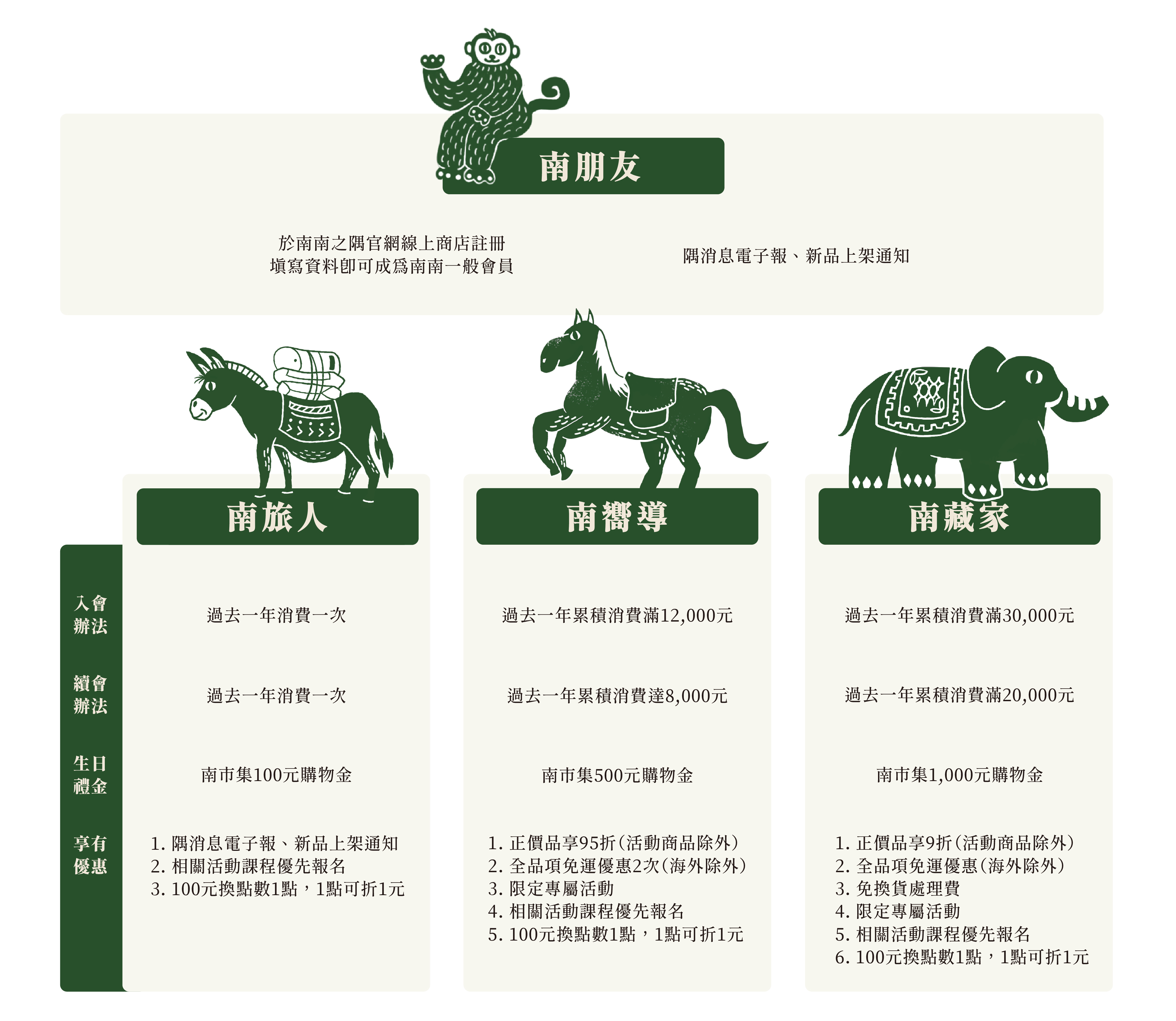 南旅人、南嚮導、南藏家的每筆訂單消費,享有會員點數回饋,可於官網、實體店的正價品(南食舖、活動商品除外)消費時使用。消費每滿 NT$100 元即可累積 1 點,每點可折抵 NT$1 元。