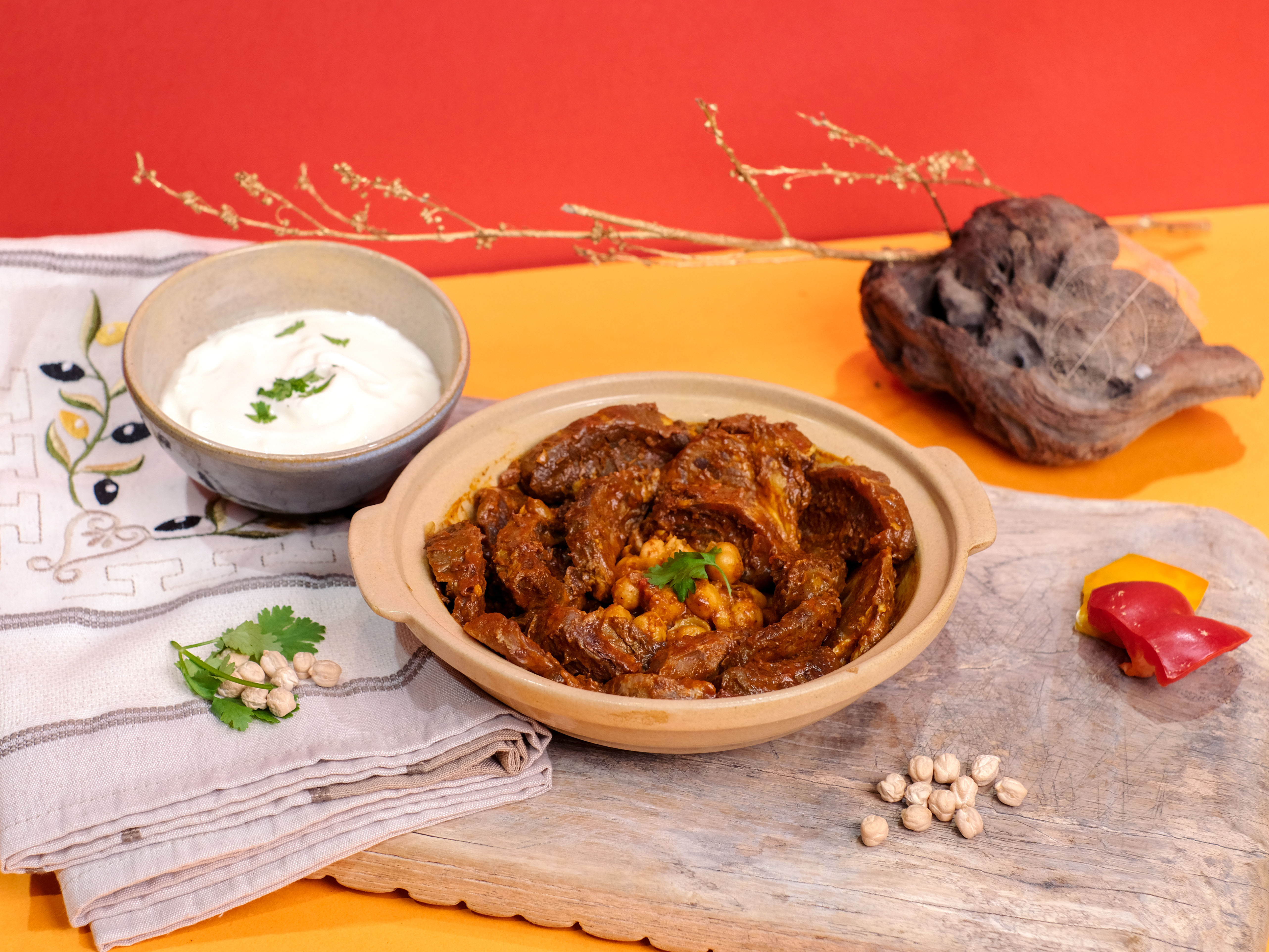 北非燉牛腩是突尼西亞、摩洛哥等北非國家經典的家庭料理,以洋蔥、番茄、鷹嘴豆為固定班底,加上突尼西亞的靈魂調料──哈里薩辣醬跟泰布爾綜合香料。經過長時間的熬煮,牛腩軟嫩到入口即化,不論配飯、配麵、或直接沾麵包食用,都令人回味無窮。