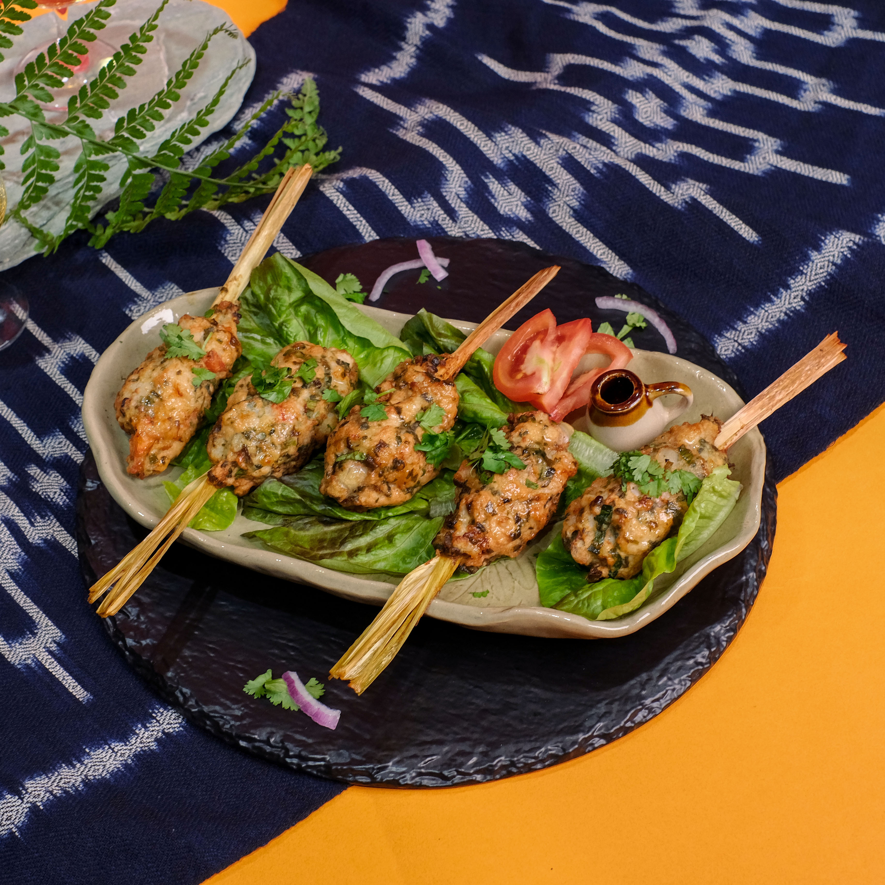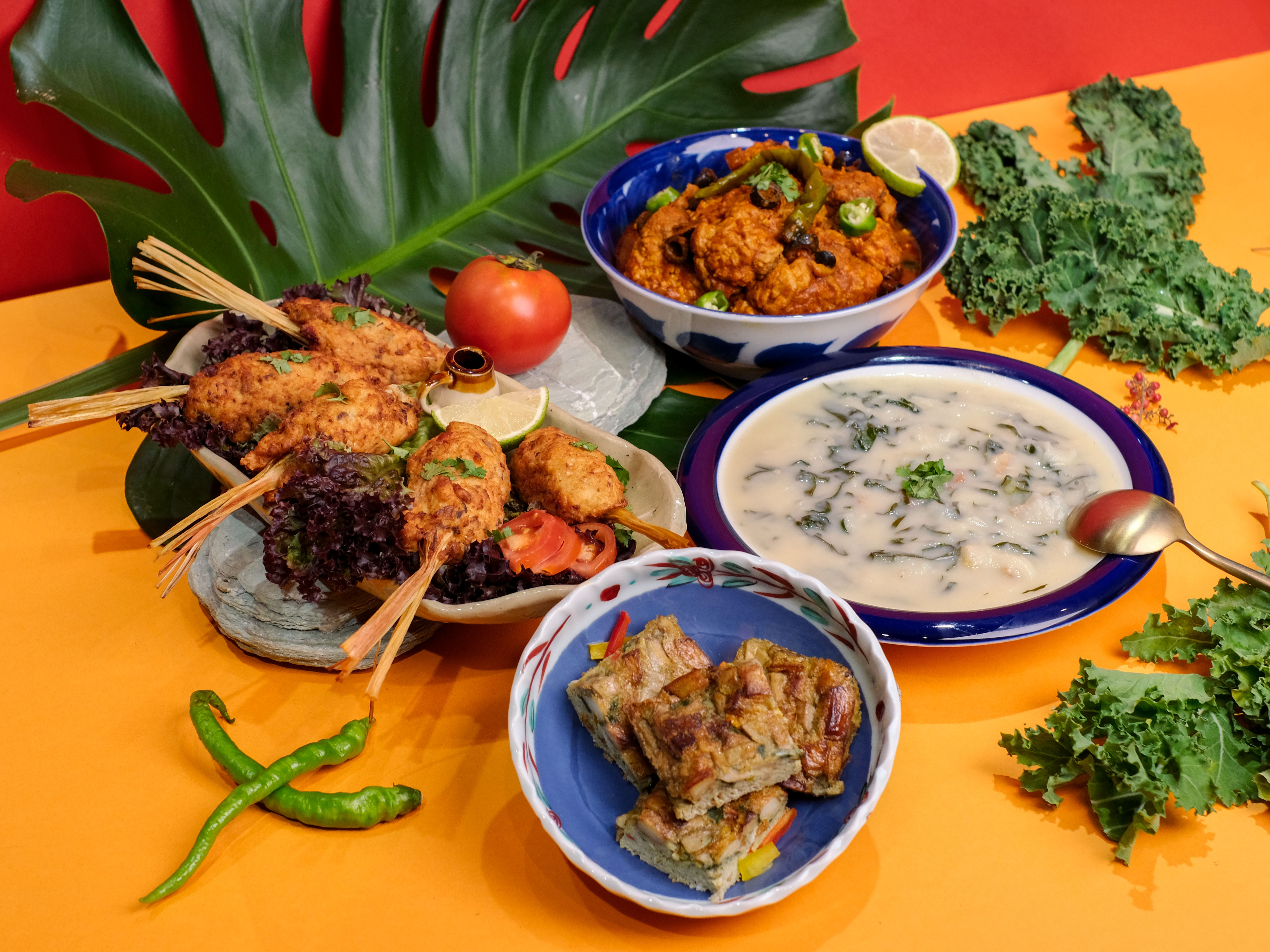這次廚師特別用新鮮的花枝與蝦打成漿,以香茅包裹,並加入獨特香氣的刺芹,其味道與香菜類似,在熱帶地方會用來治療水腫和蛇咬等症狀。另有以鷹嘴豆、菇類與豆腐製作蔬食版本,是台灣少見的料理,非常值得一試。