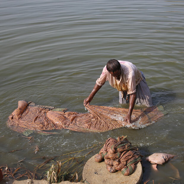 泡過Saaj的棉布維持濕潤狀態密封保存五到十天,直到散發出泡菜般的發酵氣味,在陽光下曬乾。以上步驟重複三次後,將布料清洗乾淨,泡進預染劑中清除殘留的雜質,準備進入蓋染程序。