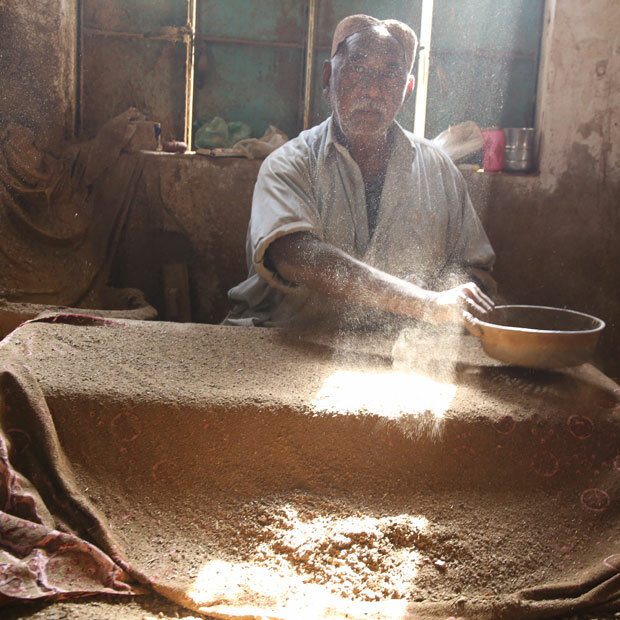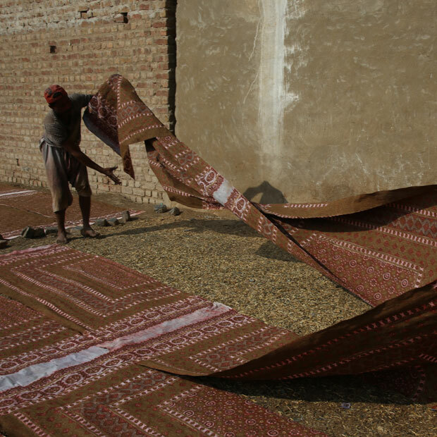 南南這次合作的巴基斯坦蓋染工作坊創辦人、同時也是蓋染的研究權威Noorjehan Bilgrami在1990年出版了介紹蓋染工藝的書本《Sindh Jo Ajrak》,書中提到一塊木蓋印花章可能需要五位雕刻師利用三天時間才能完成,製作一塊蓋染服裝可能需要二十個人,完成共21道工序。