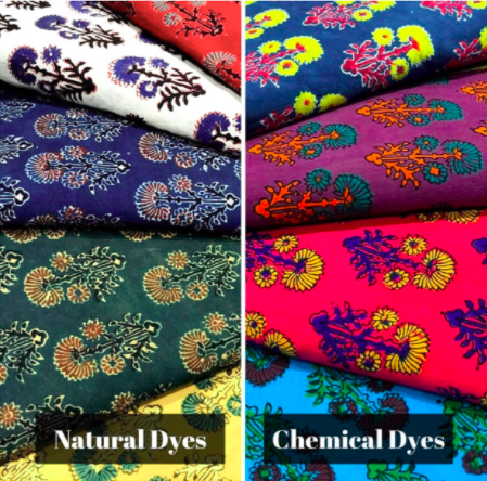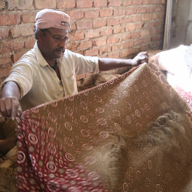 在一個大銅桶中,用茜草進行染色。在火的加熱下,工匠勤奮地將布反覆提起並浸泡幾個小時,直到達到所需的紅色。接著以靛青進行染色,第二天早上日出前,將染色的布帶到河邊浸泡清洗。在反覆染色、日曬與清洗的過程中,蓋染的印花變得越來越清晰。