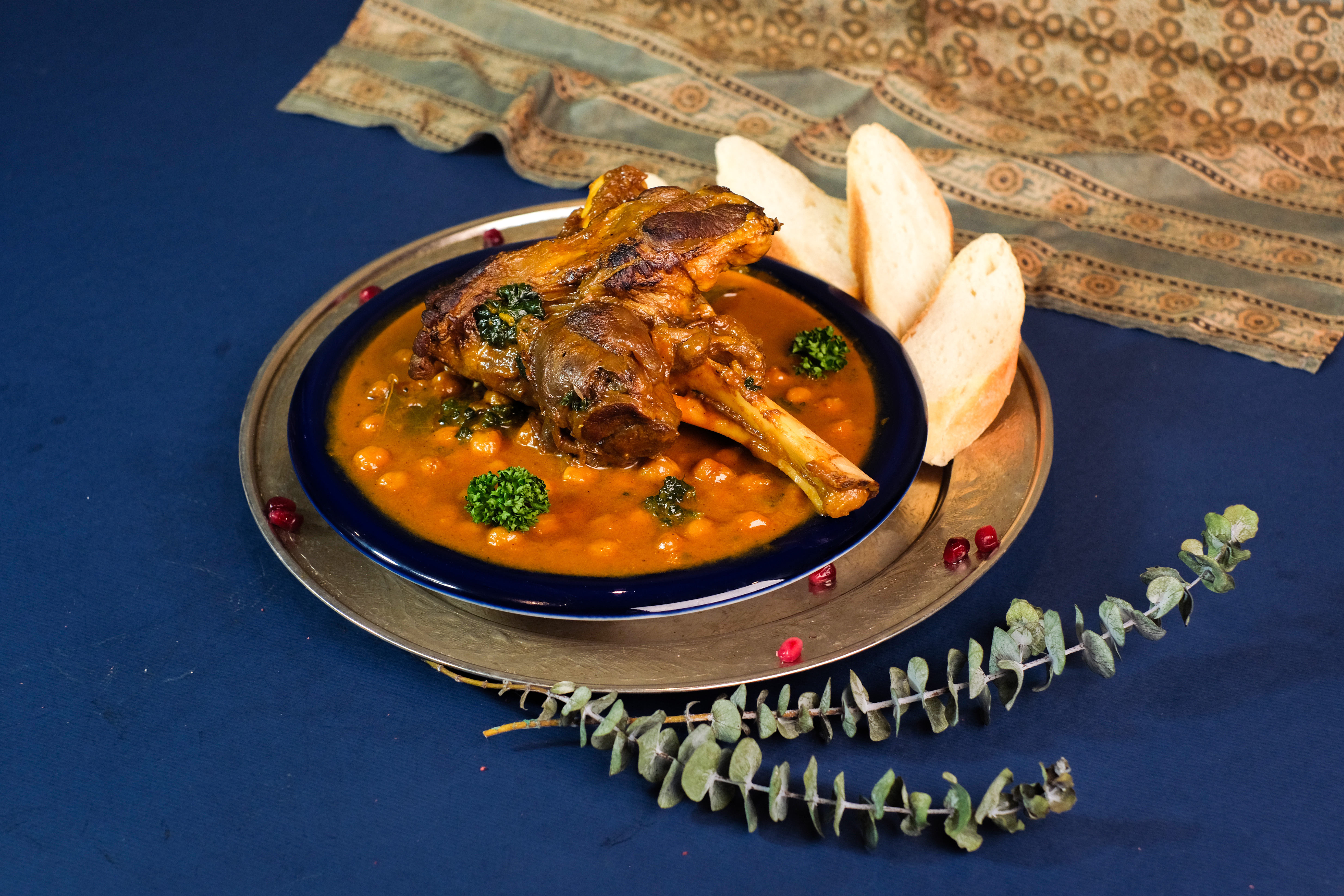 伊朗古城亞茲德的名菜,將結實的羊膝與鷹嘴豆、薑黃、肉豆蔻、肉桂、月桂葉、巴西里以及世界上最昂貴的香料番紅花燉煮到軟嫩濃郁,產生膠質,成為傳承千年仍雋永經典的波斯料理,當地會將麵包或大餅蘸燉羊膝的肉汁一起吃,也很適合搭配米飯,優雅的味道彷彿穿越時空回到古老的波斯。
