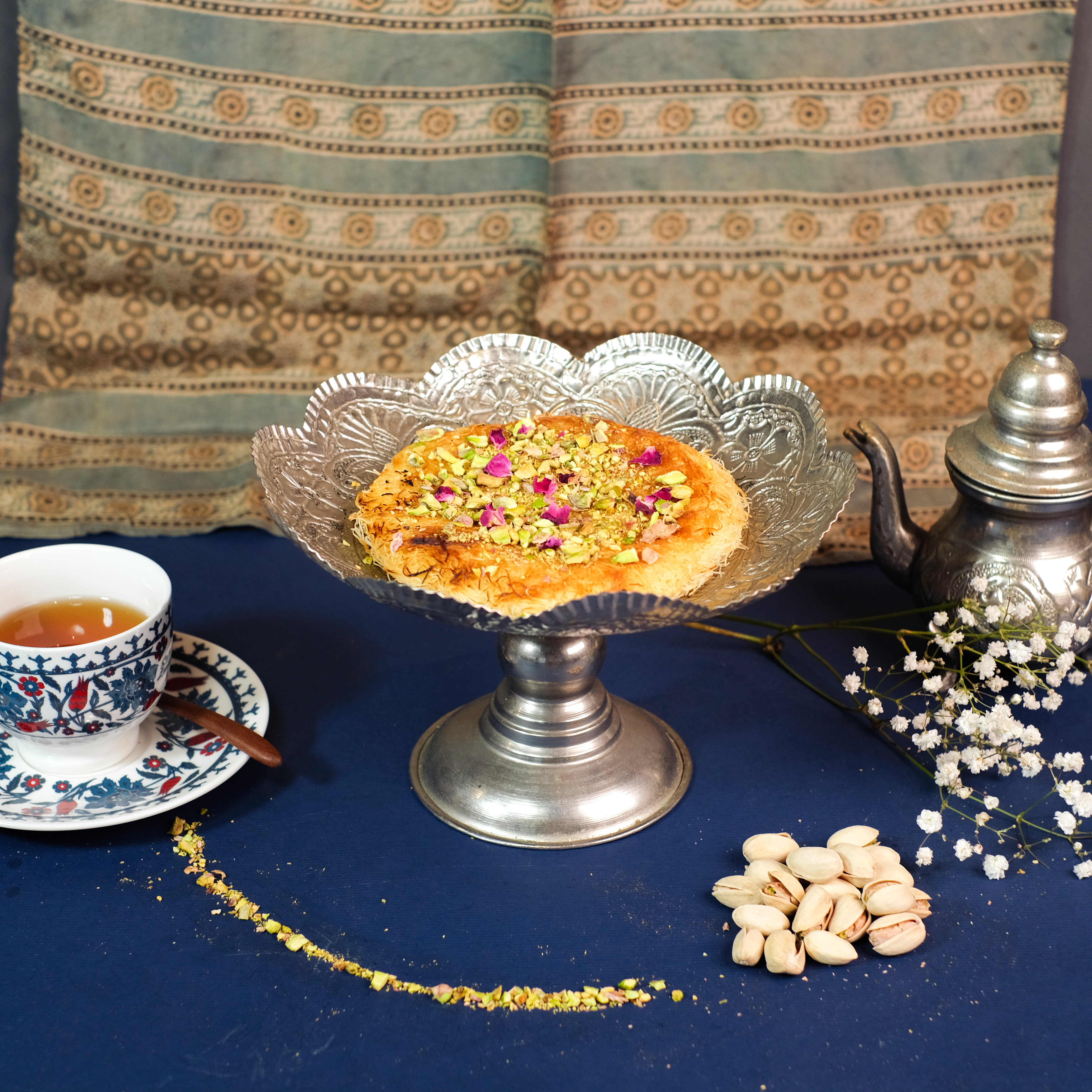 西元10世紀即流傳於中東地區的庫納法,根據歷史記載是為了讓哈里發國王在齋戒期間充飢所發明的甜點,由烤到金黃酥脆的奶油酥皮搭配開心果起司餡,淋上濃郁的糖漿,是一吃就會愛上的中東經典甜點,廚師特別為臺灣製作減糖版本。