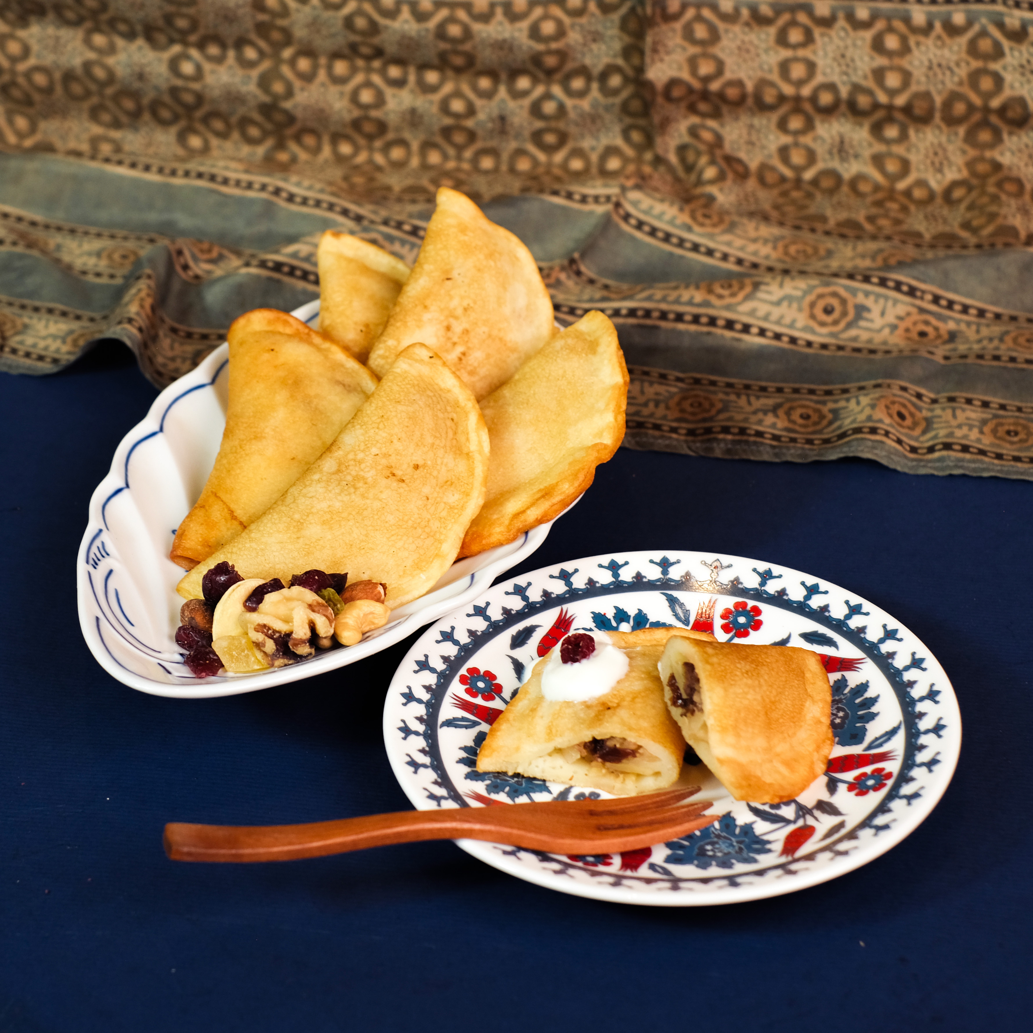 卡塔耶夫是齋戒月限定的傳統點心,作法與可麗餅有點類似,將麵糊在煎鍋煎熟一面後,包入內含起司、綜合堅果等滿滿的甜餡料,吃起來非常滿足。中東的穆斯林在齋戒月期間不僅街頭小舖有販售,人們也會買餅皮回去全家一起包入自己喜歡的餡料的獨家卡塔耶夫,是中東齋戒月的甜蜜記憶。