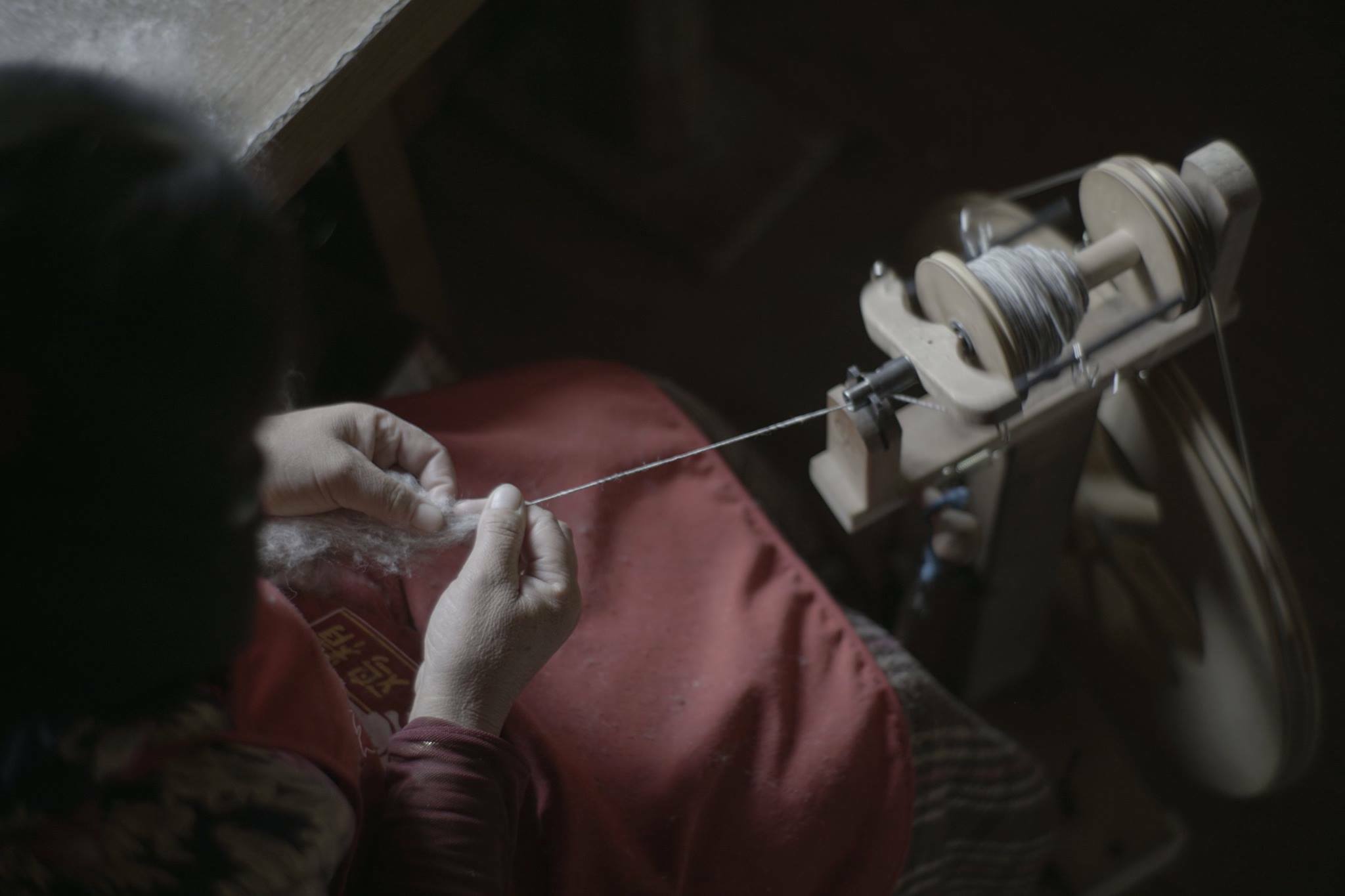 布的製成都是經線與線的穿梭編織而成,因此,編織布料的第一要素就是線。不同於機器加工粗細一致的棉線,手捻線是由紡織者親手捻製而成,流曳過拇指與食指,這些原本可能掉在草原上隨風而逝、蓬鬆而細短的牛絨被吸進紡紗機的漩窩中,絨毛纖維在旋轉時有一個奇特的特性——將其周圍的纖維也一起連帶卷入,使得再怎麼細小的纖維也能被捻成連續不斷、緊實的線。