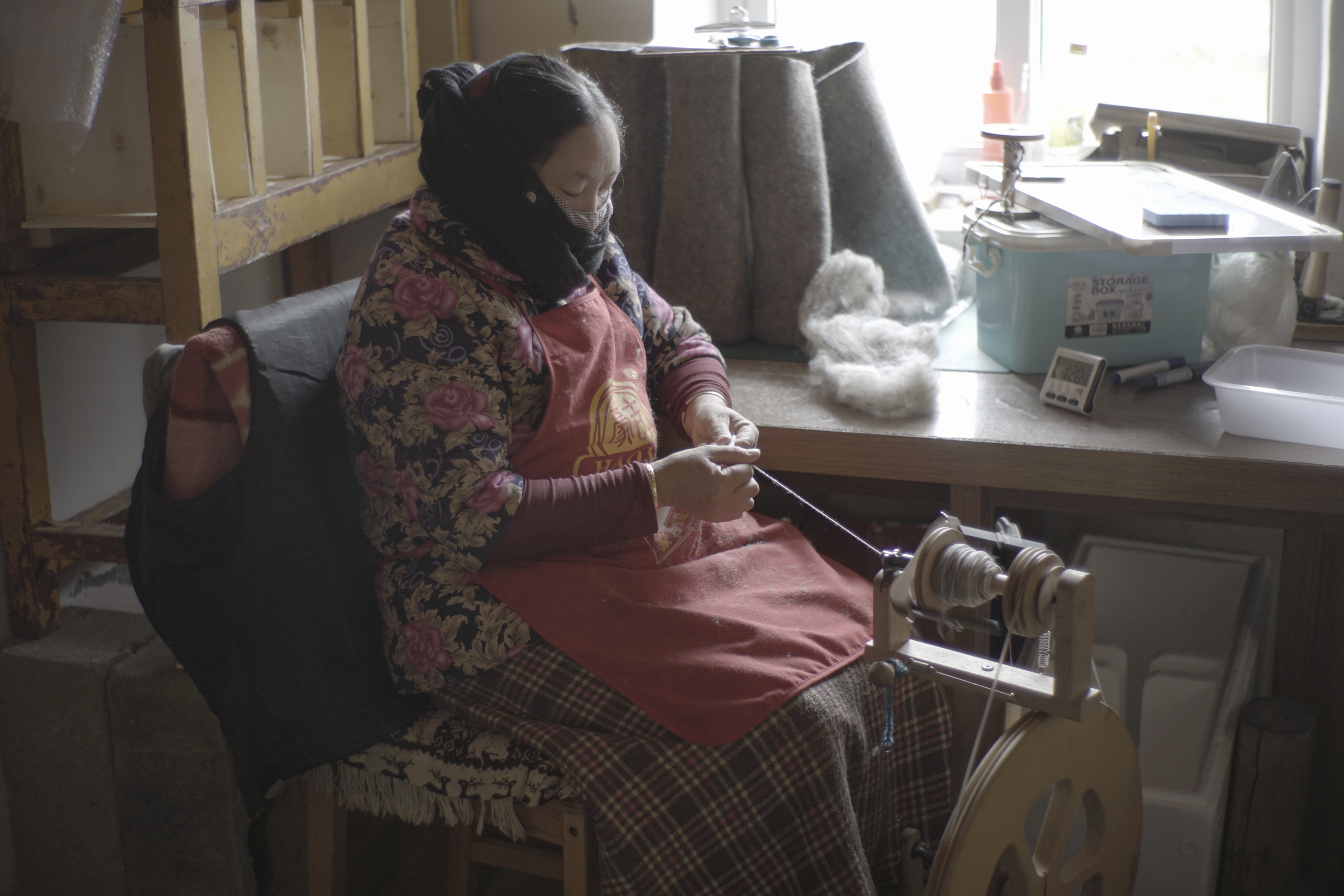 透過紡線者富有經驗、耐心與協調的手、眼、腳,以不同的旋轉速度,隨心變化出不同的線材,捻製出美麗而獨特、富有溫度與生命力的手捻線。這次製作的手捻麻花帽,收集牧養牛羊群身上的絨毛,以手工方式製作出更符合現代人穿搭的冬日毛帽,透過一針一線親手編織,有別於機器大量生產的單一版型,每一件氂牛絨麻花帽都有著獨特自然的曲線,留住手工的豐富質地與痕跡。