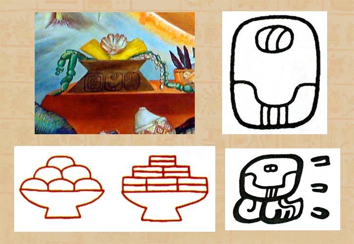 馬雅人描繪的玉米粽:早期特奧蒂瓦坎風格的彩繪碗(左下)和 Rino Lazo 所描繪的壁畫(左上)