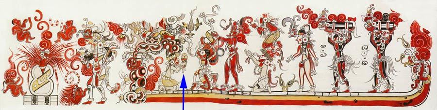 瓜地馬拉聖巴特羅遺跡壁畫中,女子向神明供奉玉米粽