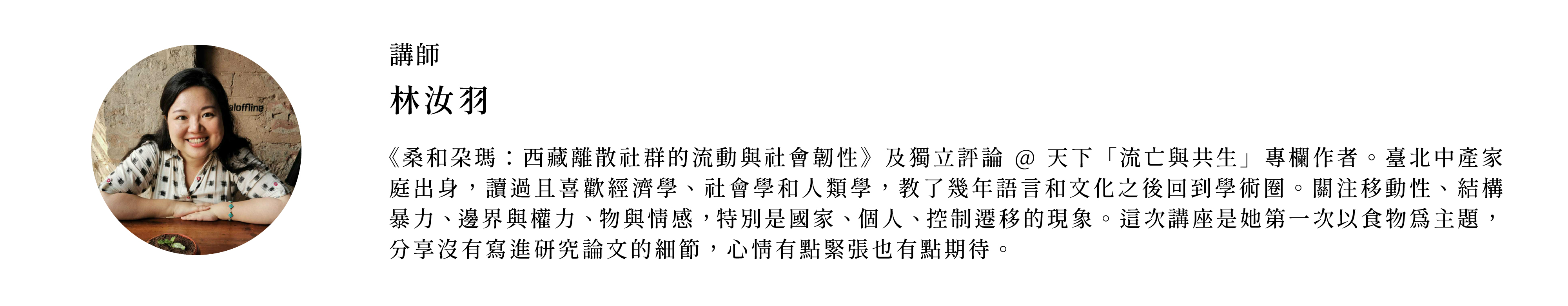 糌粑與酥油茶,是西藏民族在平均海拔五千公尺青藏高原發展出的飲食文化,然而持續半世紀的流亡潮,許多藏人離開世代居住的高原,他們在飲食中重新追尋家的記憶?這次講座邀請到關心藏人流離主題的學者作家林汝羽,分享離開高原的藏人們,在新的棲身落腳處-巴黎,重新打造家常食物與新生活。這次講座也邀大家一起品嘗特別的藏人料理。