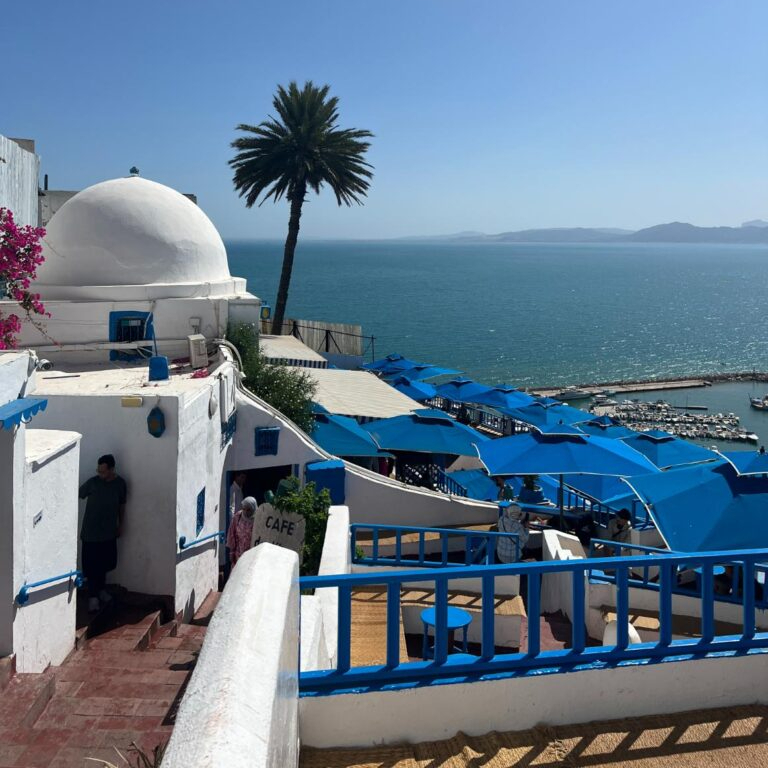聖布薩德是突尼西亞北岸著名的藍白小鎮,坐落於突尼斯灣的山坡上。在突尼斯人眼中,藍色象徵著和平與安定,因此鎮上所有建築皆僅以白牆與藍窗兩色妝點,成就了這座小鎮獨特的地中海印象。旅人常在百年咖啡館點一壺薄荷茶,靜靜看著陽光落在海面上,感受這座小鎮的生活節奏。