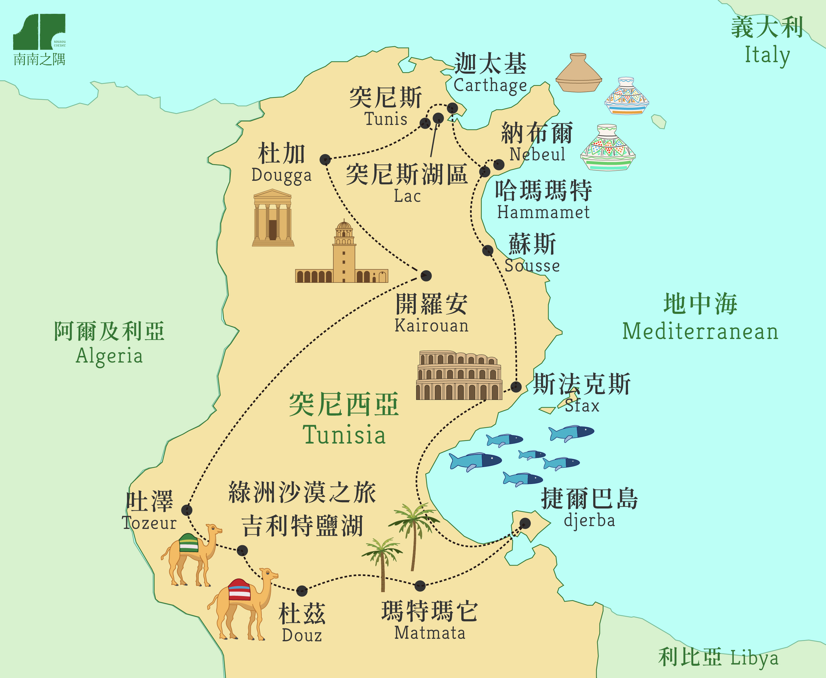 突尼西亞匯聚了迦太基、柏柏爾原住民、羅馬、鄂圖曼土耳其、法國殖民以及最終伊斯蘭文化,這些極為多元不同的歷史也都留下了建築痕跡,這趟踩線踏查行程,我們也不會錯過必訪的歷史景點,而許多都被聯合國列入了世界文化遺產中,甚至成了知名電影星際大戰的拍攝場景,以及台灣天團五月天的MV拍攝地,一起走訪過去與現在的北非突尼西亞。