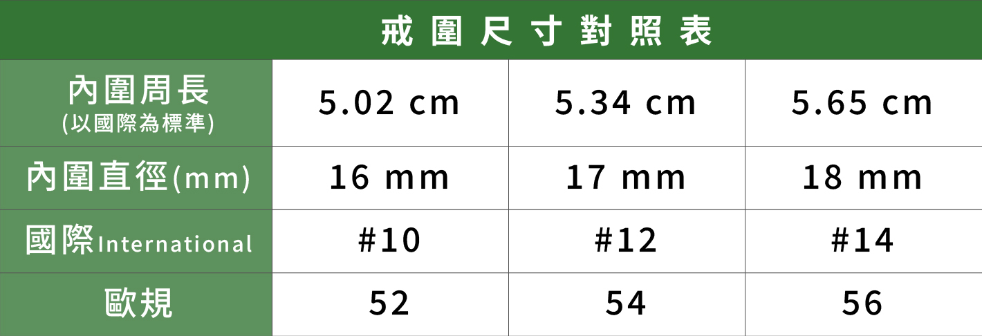 • 訂購戒圍:請參考以下戒圍表,勾選您想要的戒指內圍尺寸,若有其他特殊戒圍,請於備註欄註明