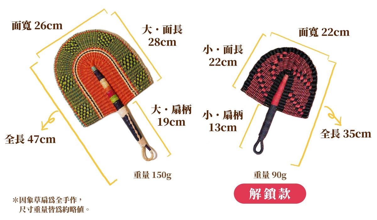 • 手工編織製作的象草扇,不像機器製作般工整,實際的顏色和形狀等細節可能無法和照片達100%精準,也可能有手工痕跡屬正常範圍,並不影響使用與收藏。每支象草扇尺寸可能會有數公分的誤差,款式顏色因螢幕顯示不同可能有些微色差。